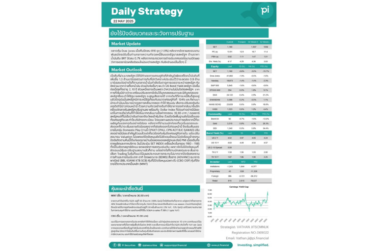 วันที่ 22 พฤษภาคม 2568 ตลาดหุ้น Dow Jones เมื่อคืนปิดลบ 816 จุด (-1.9%) หลังจากอัตราผลตอบแทนพันธบัตรปรับขึ้นท่ามกลางความกังวลหนี้สินของรัฐบาลสหรัฐฯ ด้านราคาน้ำมันดิบ BRT ปิดลบ 0.7% หลังจากกระทรวงการต่างประเทศของโอมานเปิดเผยว่าการเจรจานิวเคลียร์รอบใหม่ระหว่างสหรัฐฯกับอิหร่านจะมีในเร็วๆนี้