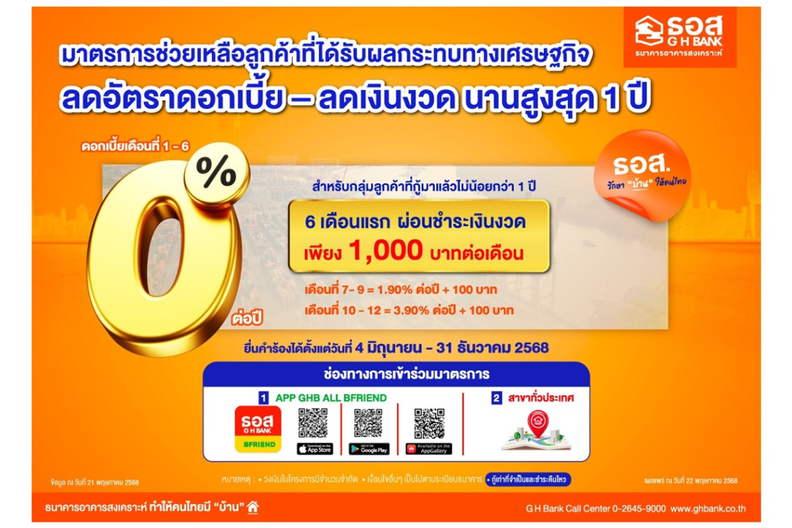 ธนาคารอาคารสงเคราะห์ (ธอส.) ขานรับนโยบายนายพิชัย ชุณหวชิร รองนายกรัฐมนตรี และรัฐมนตรีว่าการกระทรวงการคลัง เตรียมกรอบวงเงิน 30,000 ล้านบาท จัดทำมาตรการช่วยเหลือลูกหนี้ที่ได้รับผลกระทบทางเศรษฐกิจ (DC3) เพื่อช่วยเหลือลูกค้ากลุ่มที่ต้องเฝ้าระวังเป็นพิเศษ (SM) ให้กลับมามีความสามารถในการผ่อนชำระเงินงวดได้ตามปกติ เพื่อรักษาบ้านของตนเองไว้ได้ต่อไป ด้วยการปรับลดอัตราดอกเบี้ยและเงินงวด นานสูงสุด 1 ปี ผู้ที่สนใจสามารถลงทะเบียนแจ้งความประสงค์เข้าร่วมมาตรการผ่าน Application : GHB ALL BFRIEND และสาขาทั่วประเทศ ตั้งแต่วันที่ 4 มิถุนายน – 31 ธันวาคม 2568