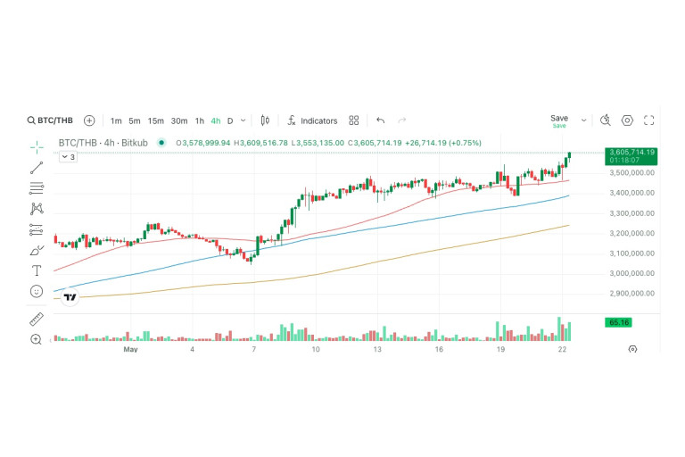 เมื่อวันที่ 22 พฤษภาคม 2568 เหรียญบิตคอยน์ (BTC) สร้างสถิติราคาสูงสุดตลอดกาลครั้งใหม่ (All Time High) ด้วยราคา 1 BTC = 110,998.52 ดอลลาร์สหรัฐ ซึ่งเป็นระดับสูงสุดใหม่จากระดับสูงสุดเดิมที่เคยทำไว้ที่เมื่อเดือนมกราคม 2568 ตามข้อมูลจากเว็บไซต์ coinmarketcap.com ส่วนบนกระดานไทย บิทคับ เอ็กซ์เชนจ์ ราคาล่าสุด ณ วันที่ 22 พฤษภาคม 2568 BTC อยู่ที่ 3,605,714.19 บาท โดยราคา Bitcoin (BTC) ใน 24 ชั่วโมงมีการปรับตัวเพิ่มขึ้น 3.22% มีราคาสูงสุดอยู่ที่ 3,620,000.00 บาท และมีราคาต่ำสุด ที่ 3,466,230.01 บาท อ้างอิงราคา BTC จาก https://www.bitkub.com/th/market/btc