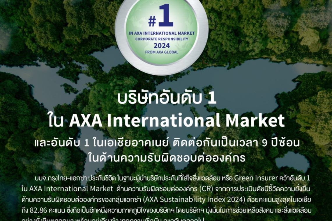 บมจ.กรุงไทย-แอกซ่า ประกันชีวิต ในฐานะผู้นำบริษัทประกันที่ใส่ใจสิ่งแวดล้อม หรือ Green Insurer คว้าอันดับ 1 ใน AXA International Market และอันดับ 1 ในเอเชียอาคเนย์ติดต่อกัน 9 ปีซ้อน ในด้านความรับผิดชอบต่อองค์กร (CR) จากการประเมินดัชนีชี้วัดความยั่งยืนด้านความรับผิดชอบต่อองค์กรของกลุ่มแอกซ่า (AXA Sustainability Index 2024) ด้วยคะแนนสูงสุดในเอเชียถึง 82.86 คะแนน ซึ่งถือเป็นอีกหนึ่งความภาคภูมิใจ ในฐานะผู้นำด้านบริษัทประกันที่ใส่ใจสิ่งแวดล้อม “Green Insurer” และเป็นการตอกย้ำจุดยืนของบริษัทฯ ในการสนับสนุนให้ทุกคนร่วมกันเป็นแรงขับเคลื่อนสำคัญในการใส่ใจสิ่งแวดล้อม และเป็นส่วนหนึ่งของการช่วยฟื้นฟูระบบนิเวศน์ และความหลากหลายทางชีวภาพในทะเล ผ่านโครงการระยะยาวต่างๆ อาทิ โครงการ Save Our Sea ที่สนับสนุนการอนุบาลเต่าทะเล ปลูกป่าชายเลน และการให้ความรู้ด้านการรักษาสิ่งแวดล้อมทางทะเลกับเยาวชนไทย พร้อมทั้งโครงการ Save Our River ซึ่งเป็นโครงการที่สนับสนุนเรือไฟฟ้า (EV boat) และติดตั้งถังขยะรีไซเคิล เพื่อช่วยการจัดการขยะจากต้นทางก่อนไหลลงสู่แม่น้ำและทะเล บริษัทฯได้ตั้งเป้าหมายในการช่วยลดขยะในแม่น้ำเจ้าพระยา จำนวน 43 ตันต่อปีจากการจัดการขยะบนเรือ