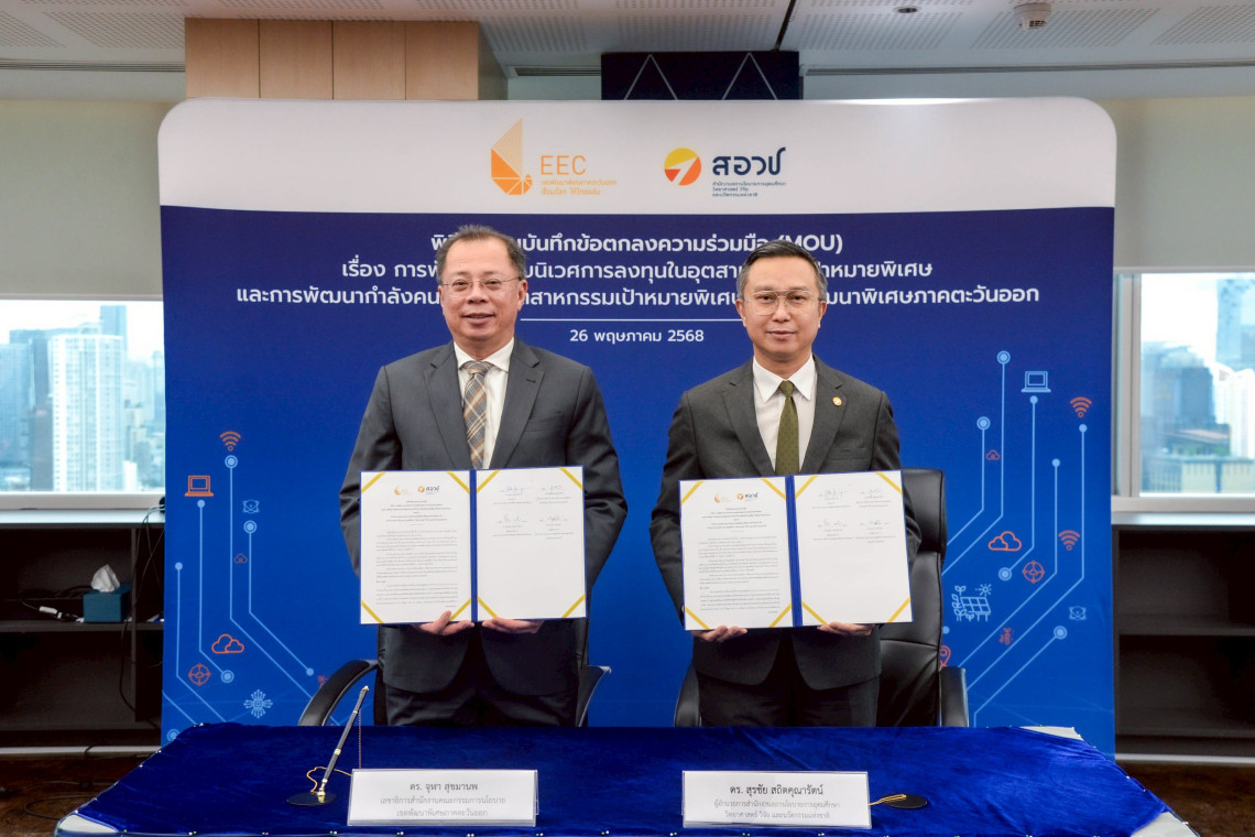 วันที่ 26 พฤษภาคม 2568 ดร.จุฬา สุขมานพ เลขาธิการคณะกรรมการนโยบายเขตพัฒนาพิเศษภาคตะวันออก (สกพอ.) หรืออีอีซี และ ดร.สุรชัย สถิตคุณารัตน์ ผู้อำนวยการสำนักงานสภานโยบายการอุดมศึกษา วิทยาศาสตร์ วิจัยและนวัตกรรมแห่งชาติ (สอวช.) ร่วมกันลงนามบันทึกข้อตกลง (MOU) เรื่องการพัฒนาระบบนิเวศการลงทุนในอุตสาหกรรมเป้าหมายพิเศษและการพัฒนากำลังคนรองรับอุตสาหกรรมเป้าหมายพิเศษในเขตพัฒนาพิเศษภาคตะวันออก ระหว่าง สกพอ.และ สอวช. เพื่อร่วมกันติดตามสถานการณ์ของเทคโนโลยีในอุตสาหกรรมเป้าหมายพิเศษในเขตพัฒนาพิเศษภาคตะวันออก หรือ พื้นที่อีอีซี พร้อมกับสนับสนุนการลงทุนด้านเทคโนโลยีขั้นสูง ผ่านการขับเคลื่อนนโยบายด้านวิทยาศาสตร์ เทคโนโลยี และนวัตกรรม และยกระดับเครือข่ายด้านการวิจัยและพัฒนาในประเทศ