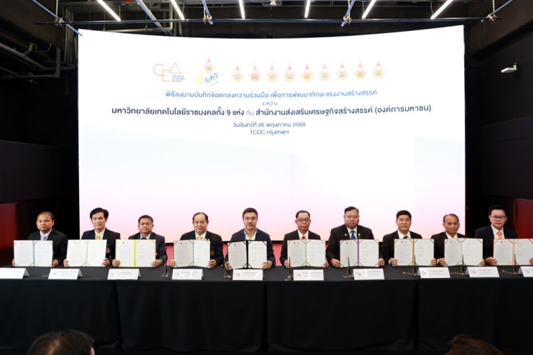 วันที่ 26 พ.ค.68 มทร.รัตนโกสินทร์ นำโดย รศ.ดร.อุดมวิทย์ ไชยสกุลเกียรติ อธิการบดี และประธานคณะกรรมการอธิการบดีมหาวิทยาลัยเทคโนโลยีราชมงคล ร่วมลงนามในพิธี บันทึกข้อตกลงความร่วมมือ (MOU) ระหว่าง มหาวิทยาลัยเทคโนโลยีราชมงคล ทั้ง 9 แห่ง กับ สำนักงานส่งเสริมเศรษฐกิจสร้างสรรค์ (องค์การมหาชน) หรือ สศส. ณ ห้อง Virtual Media Lab ชั้น 4 อาคารศูนย์สร้างสรรค์งานออกแบบ (TCDC) กรุงเทพฯ ภายในพิธีฯ ได้รับเกียรติจาก นายชาคริต พิชญางกูร ผู้อำนวยการ สศส. กล่าวต้อนรับผู้เข้าร่วมพิธี และ รศ.ดร.อุดมวิทย์ ไชยสกุลเกียรติ อธิการบดี (ประธาน ทปอ.มทร.) กล่าวถึงแนวทางความร่วมมือระหว่าง มหาวิทยาลัยเทคโนโลยีราชมงคล และ สศส. พร้อมแสดงเจตนารมณ์ในการร่วมกันผลักดันการพัฒนาศักยภาพแรงงานสร้างสรรค์ของประเทศ