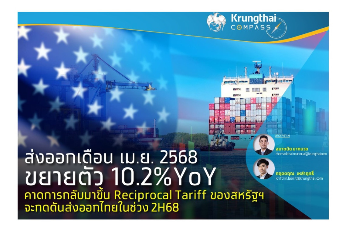 ส่งออกไทย เม.ย.โต 10.2% แต่เริ่มแผ่ว Krungthai COMPASS เตือน 2H68 เสี่ยงถูกกดดันจาก Reciprocal Tariff สหรัฐฯ