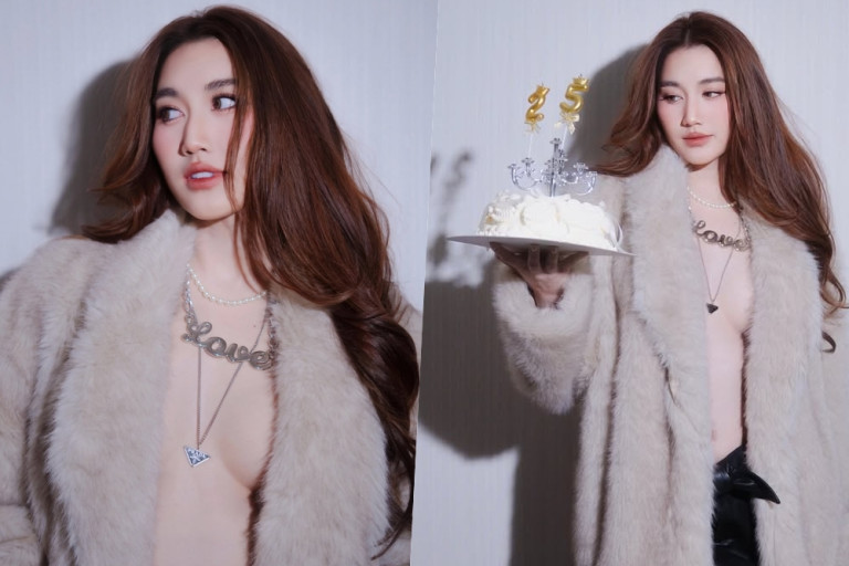 โดย เบสท์ มาในลุคแฟชั่นโค้ทขนเฟอร์สีครีมแบบโนบรา เผยความเซ็กซี่แบบพอดีมีสไตล์ พร้อมสร้อยคอคำว่า "Love" เพิ่มความเก๋ และยังถือเค้กวันเกิดสีขาวสุดหรู ที่ปักเทียนเลข 25 อย่างภาคภูมิใจ พร้อมเขียนแคปชั่นสั้น ๆ ว่า “ฉันในวัย 25 ปี..”