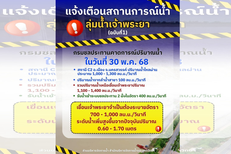 วันที่ 27 พ.ค.68 กรมชลประทาน ได้แจ้งเตือนพื้นที่ท้ายเขื่อนเจ้าพระยา จังหวัดชัยนาท หลังมีฝนตกต่อเนื่องในพื้นที่ตอนบนของลุ่มน้ำเจ้าพระยาว่า ปริมาณฝนที่ตกในระยะนี้ส่งผลให้ระดับน้ำในพื้นที่ตอนบนของลุ่มน้ำเจ้าพระยามีแนวโน้มเพิ่มขึ้นอย่างต่อเนื่อง โดยจากการคาดการณ์ในอีก 1-3 วันข้างหน้า พบว่าจะมีปริมาณน้ำไหลผ่านสถานี C.2 อำเภอเมือง จังหวัดนครสวรรค์ ประมาณ 1,000-1,300 ลูกบาศก์เมตรต่อวินาที ซึ่งจะทำให้ปริมาณน้ำเหนือเขื่อนเจ้าพระยาเพิ่มสูงขึ้น จึงมีความจำเป็นต้องระบายน้ำผ่านท้ายเขื่อนเจ้าพระยาอยู่ในอัตราระหว่าง 700-1,000 ลูกบาศก์เมตรต่อวินาที ซึ่งจะส่งผลให้พื้นที่ริมน้ำ บริเวณพื้นที่ลุ่มต่ำนอกคันกั้นน้ำบริเวณคลองโผงเผง จังหวัดอ่างทอง คลองบางบาล จังหวัดพระนครศรีอยุธยา และตำบลหัวเวียง อำเภอเสนา ตำบลลาดชิด ตำบลท่าดินแดง อำเภอผักไห่ จังหวัดพระนครศรีอยุธยา (แม่น้ำน้อย) มีระดับน้ำเพิ่มสูงขึ้นจากปัจจุบันอีกประมาณ 0.6-1.7 เมตร ซึ่งระดับน้ำที่เพิ่มสูงขึ้นนี้ยังไม่ส่งผลกระทบต่อพื้นที่ชุมชน