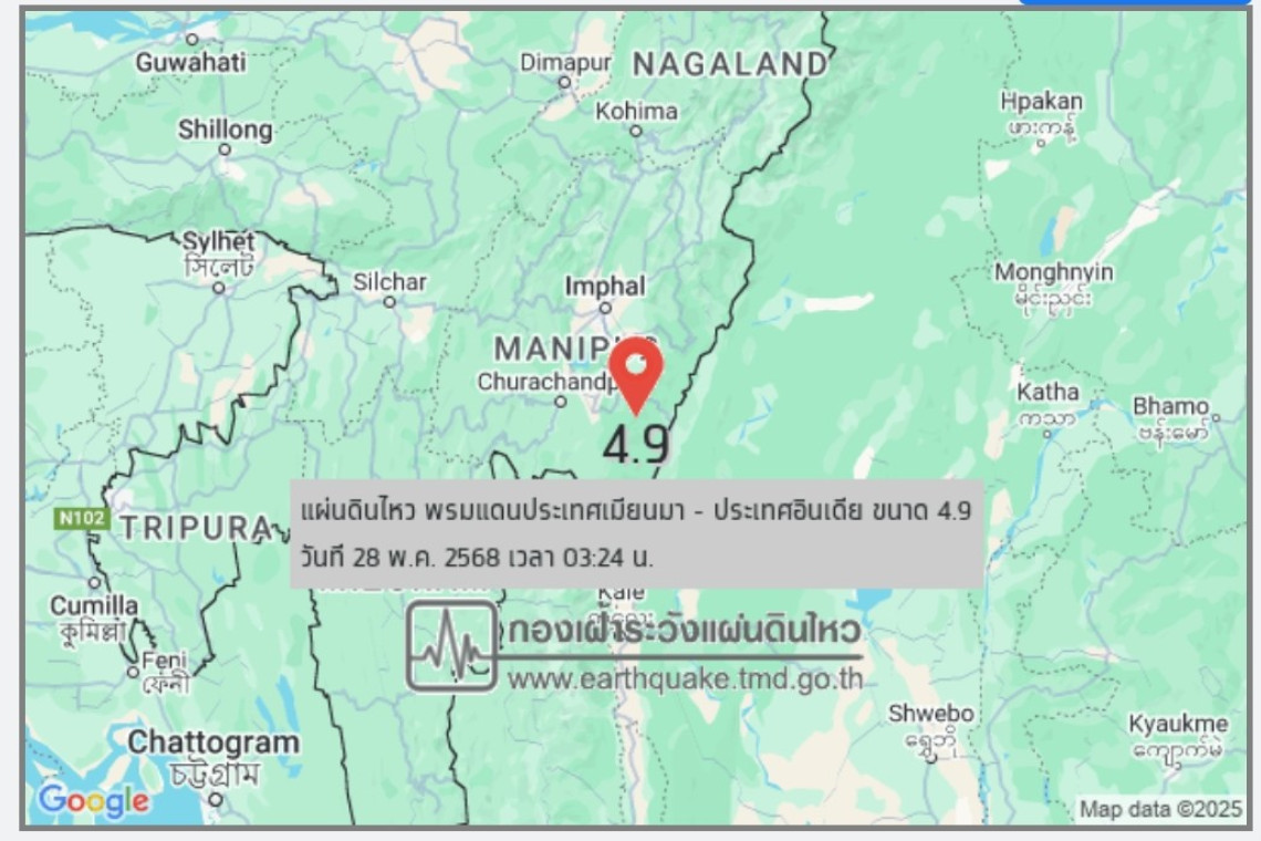 ต่อมาเวลา 03:24 น. โดยขนาดความแรงสูงสุดถึง 4.9ริกเตอร์ ความลึก10กม. ที่พรมแดนประเทศเมียนมา - ประเทศอินเดีย