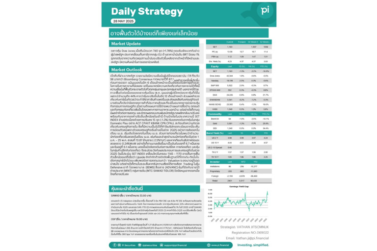 วันที่ 28 พฤษภาคม 568 บล.พายเผยว่า ตลาดหุ้น Dow Jones เมื่อคืนปิดบวก 740 จุด (+1.78%) ตอบรับเชิงบวกกับข่าวผู้นำสหรัฐฯประกาศเลื่อนเก็บภาษีจากกลุ่ม EU ด้านราคาน้ำมันดิบ BRT ปิดลบ 1% ถูกกดดันจากความกังวลอุปทานน้ำมันจะปรับตัวขึ้นหลังจากเจ้าหน้าที่อิหร่านและสหรัฐฯมีความคืบหน้าในการเจรจานิวเคลียร์