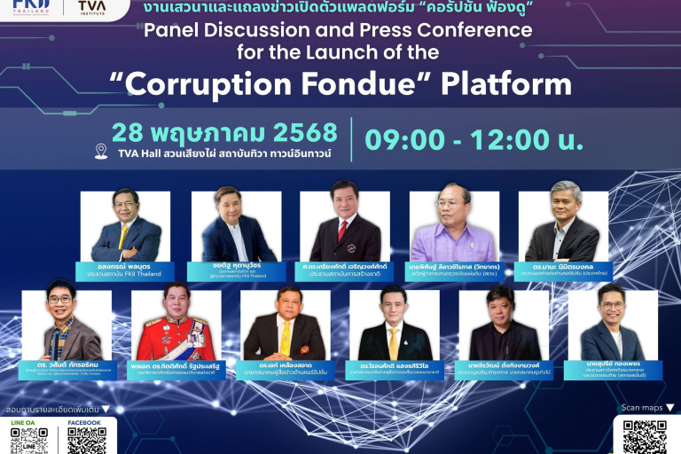 วันพุธที่ 28 พฤษภาคม 2568 เวลา 09.00 – 12.00 น. ที่ TVA Hall สวนเสียงไผ่ สถาบันทิวา ทาวน์อินทาวน์ กรุงเทพมหานคร พบกับ การบรรยายพิเศษหัวข้อ “คอรัปชั่น ปัญหาวิกฤติชาติ กับแนวทางแก้ไข?” โดยผู้ทรงคุณวุฒิ ได้แก่ ศ.ดร.เกรียงศักดิ์ เจริญวงศ์ศักดิ์ ประธานสถาบันการสร้างชาติ ดร.มานะ นิมิตรมงคล ประธานองค์กรต่อต้านคอร์รัปชัน (ประเทศไทย) นายพิศิษฐ์ ลีลาวชิโรภาส อดีตผู้ว่าการตรวจเงินแผ่นดิน (สตง.) ดร.วสันต์ ภัทรอธิคม ผู้ช่วยผู้อำนวยการสำนักงานพัฒนาวิทยาศาสตร์และเทคโนโลยีแห่งชาติ (สวทช.) และ นายชยดิฐ หุตานุวัชร์ ประธานสถาบันทิวา และผู้อำนวยการสถาบันเอฟเคไอไอ. รวมทั้ง นายอลงกรณ์ พลบุตร ประธานสถาบันเอฟเคไอไอ.บรรยาย หัวข้อ “คอรัปชั่นเทคโนโลยี คอรัปชั่นฟ้องดู โครงการใยแมงมุมต้านโกง” นายวรวุฒิ ชิระนุรังสี ผู้จัดการสถาบัน เอฟเคไอไอ.แนะนำการใช้งาน คอรัปชั่น ฟ้องดู (Corruption Fondue)