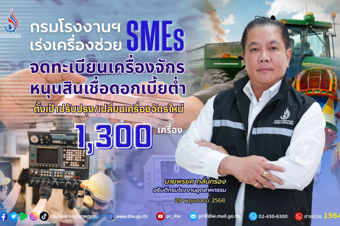 วันที่ 28 พฤษภาคม 2568 นายพรยศ กลั่นกรอง อธิบดีกรมโรงงานอุตสาหกรรม เปิดเผยว่า โครงการเร่งรัดการจดทะเบียนเครื่องจักรของวิสาหกิจขนาดกลางและขนาดย่อม” ภายใต้ค่าใช้จ่ายในการส่งเสริมปรับเปลี่ยนเครื่องจักร เพื่อเพิ่มประสิทธิภาพ ประจำปีงบประมาณ 2568 เพื่อสนับสนุนผู้ประกอบการ SMEs ที่ต้องการยกระดับประสิทธิภาพการผลิตผ่านการปรับปรุงหรือเปลี่ยนเครื่องจักรใหม่ เพิ่มโอกาสการเข้าถึงแหล่งเงินทุนได้มากขึ้น โดยคัดเลือกโรงงานเข้าร่วมโครงการแล้ว 50 แห่ง และจัดอบรมความรู้แก่ผู้ประกอบการเมื่อวันที่ 22 เมษายน 2568 ผ่านระบบออนไลน์ ในประเด็นสำคัญ คือ การประเมินประสิทธิภาพด้านพลังงานของเครื่องจักร เทคนิคการลดต้นทุนและการใช้พลังงานทดแทน และความรู้เกี่ยวกับคาร์บอนฟุตพริ้นท์ เพื่อเตรียมพร้อมสู่มาตรฐานสากล