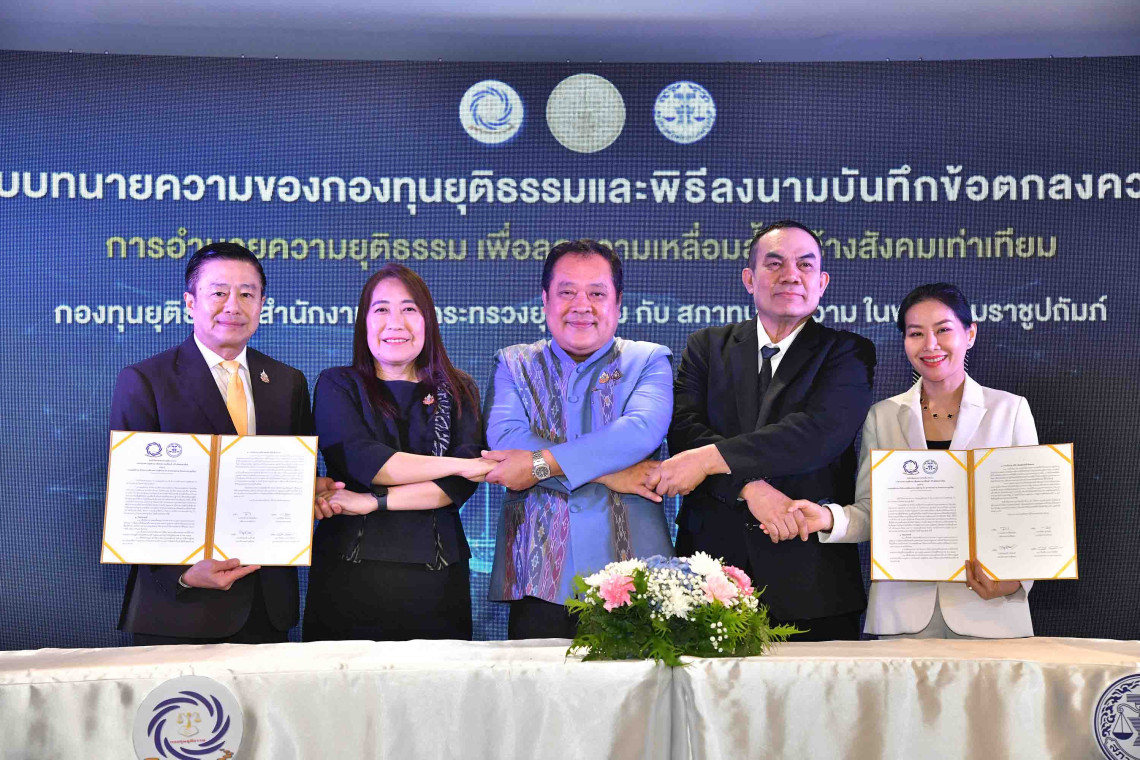 เมื่อวันอังคารที่ 27 พฤษภาคม 2568 เวลา 11.00 น. ที่ห้องประชุมสนฉัตร ชั้น 3 อาคารกระทรวงยุติธรรม พันตำรวจเอก ทวี สอดส่อง รัฐมนตรีว่าการกระทรวงยุติธรรม ในฐานะสภานายกพิเศษแห่งสภาทนายความ นางพงษ์สวาท นีละโยธิน ปลัดกระทรวงยุติธรรม พร้อมด้วย ดร.วิเชียร ชุบไธสง นายกสภาทนายความ ร่วมลงนามบันทึกข้อตกลงความร่วมมือ (MOU) “การอำนวยความยุติธรรม เพื่อลดความเหลื่อมล้ำ สร้างสังคมเท่าเทียม” ระหว่าง สภาทนายความ ในพระบรมราชูปถัมภ์ กับ กองทุนยุติธรรม สำนักงานปลัดกระทรวงยุติธรรม เพื่อร่วมกันบูรณาการความช่วยเหลือลดความเหลื่อมล้ำ ให้ประชาชนเข้าถึงความยุติธรรมได้อย่างสะดวก ทั่วถึง และเท่าเทียม โดยมี นายไตรยฤทธิ์ เตมหิวงศ์ รองปลัดกระทรวงยุติธรรม ดร.วิรัลพัชร เวธทาวริทธิ์ธร อุปนายกฝ่ายวิชาการ สภาทนายความ ผู้แทนจากหน่วยงานต่างๆ ที่เกี่ยวข้อง จำนวนกว่า 60 คน และรับชมผ่านระบบประชุมทางไกล (VDO Conference) จำนวนกว่า 187 คน เข้าร่วมเป็นสักขีพยาน