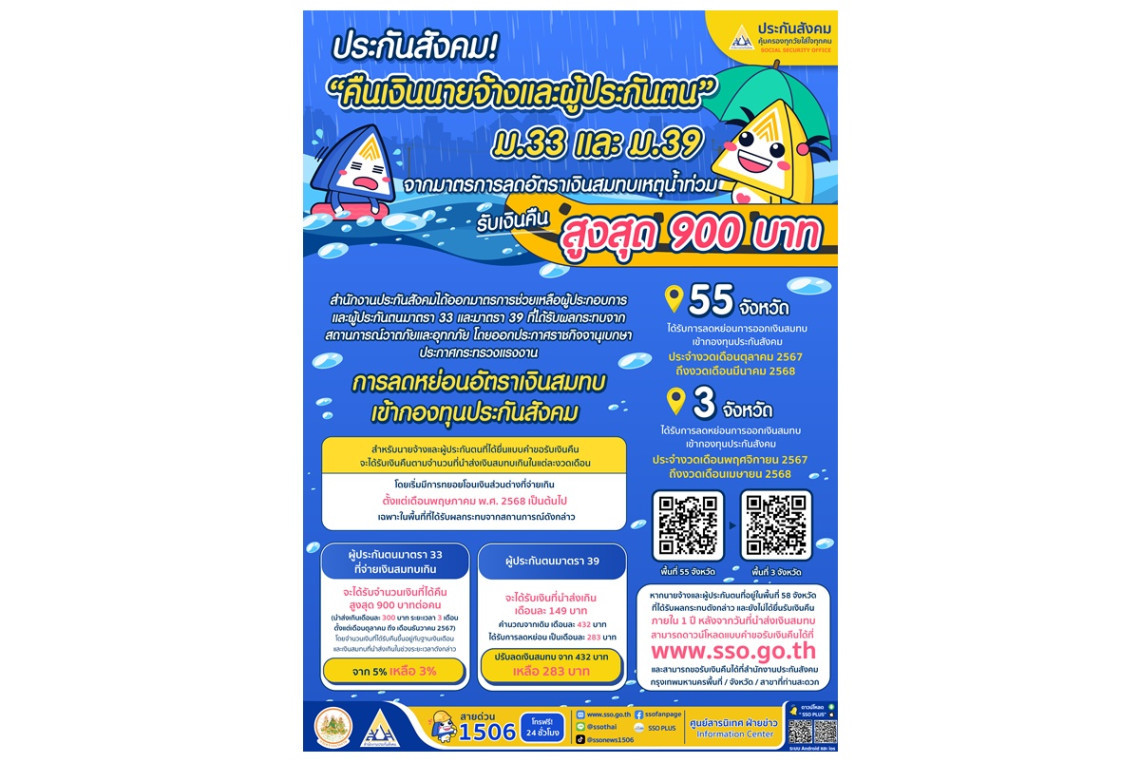 ทั้งนี้ หากนายจ้างและผู้ประกันตนที่อยู่ในพื้นที่ 58 จังหวัดที่ได้รับผลกระทบดังกล่าว และยังไม่ได้ยื่นรับเงินคืนสามารถดาวน์โหลดแบบคำขอรับเงินคืนได้ที่ www.sso.go.th และสามารถขอรับเงินคืนได้ที่สำนักงานประกันสังคมกรุงเทพมหานครพื้นที่ ทั้ง 12 แห่ง สำนักงานประกันสังคมจังหวัด/สาขาที่ท่านสะดวก ภายใน 1 ปี หลังจากวันที่นำส่งเงินสมทบ