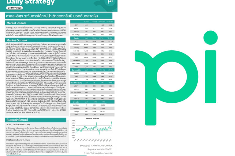 วันที่ 29 พฤษภาคม 2568 ตลาดหุ้น Dow Jones เมื่อคืนปิดลบ 0.58% (-244 จุด) หลังจากนักลงทุนซึมซับกับการรายงานผลประชุม FED ขณะเดียวกันได้จับตารอดูผลประกอบการ NVIDIA ด้านราคาน้ำมันดิบ BRT ปิดบวก 1.26% หลังจากกลุ่ม OPEC+ มีมติคงนโยบายการผลิตน้ำมันนอกจากนี้ยังได้แรงหนุนจาก Trump ไม่อนุญาตให้เชฟรอนส่งออก