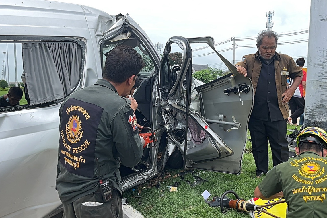 รถตู้คณะแพทย์รามาธิบดีเสียหลักพุ่งชนเสาไฟฟ้าเกาะกลางถนน 340 จ.สุพรรณบุรี บาดเจ็บ 3 ราย หวิดชนคนงานแขวงทางหลวงที่นั่งกินข้าว รอดตายหวุดหวิด