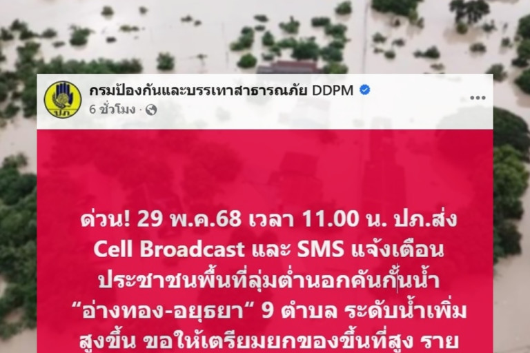 วันที่ 29 พ.ค.68 เวลา 11.00 น. กรมป้องกันและบรรเทาสาธารณภัย (ปภ.) ได้ร่วมกับผู้ให้บริการเครือข่ายโทรศัพท์เคลื่อนที่ AIS True และ NT ส่งข้อความแจ้งเตือนผ่าน Cell Broadcast และ SMS แจ้งเตือนเขื่อนเจ้าพระยาปรับอัตราระบายน้ำเพิ่มเป็น 1,000 ลูกบาศก์เมตร/วินาที ทำให้ประชาชนที่อาศัยในพื้นที่ลุ่มต่ำนอกคันกั้นน้ำจะได้รับผลกระทบจากระดับน้ำที่สูงขึ้น ในพื้นที่ 2 จังหวัด ดังนี้