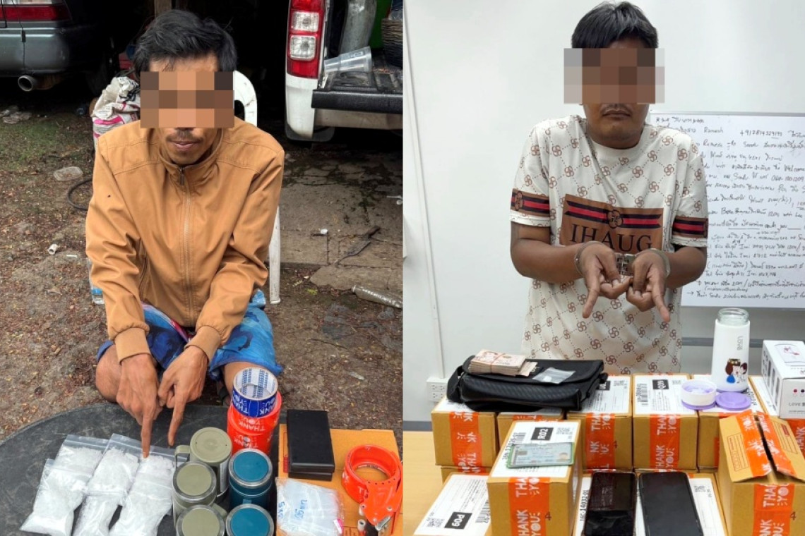 เมื่อวันที่ 31 พ.ค.68 เจ้าหน้าที่ฝ่ายสืบสวน บก.น.6 นำกำลังเข้าจับกุม นายขวัญชัย (ขอสงวนนามสกุล) อายุ 36 ปี และนายพาวิทย์ (ขอสงวนนามสกุล) อายุ 31 ปี ในข้อหา “ร่วมกันจำหน่ายยาเสพติดให้โทษประเภท 1 (เมทแอมเฟตามีนหรือยาบ้า)ฯ และประสาทประเภท 2 (เคตามีน) โดยการมีไว้เพื่อจำหน่ายโดยฝ่าฝืนต่อกฎหมาย อันเป็นการกระทำเพื่อการค้า” พร้อมของกลาง ยาไอซ์รวม 636.60 กรัม, เคตามีน 1.39 กรัม, เงินสด 54,400 บาท, สร้อยคอทองคำรูปพรรณ, แหวนทองคำรูปพรรณ, รถจักรยานยนต์ 2 คัน มูลค่ารวมประมาณ 314,400 บาท