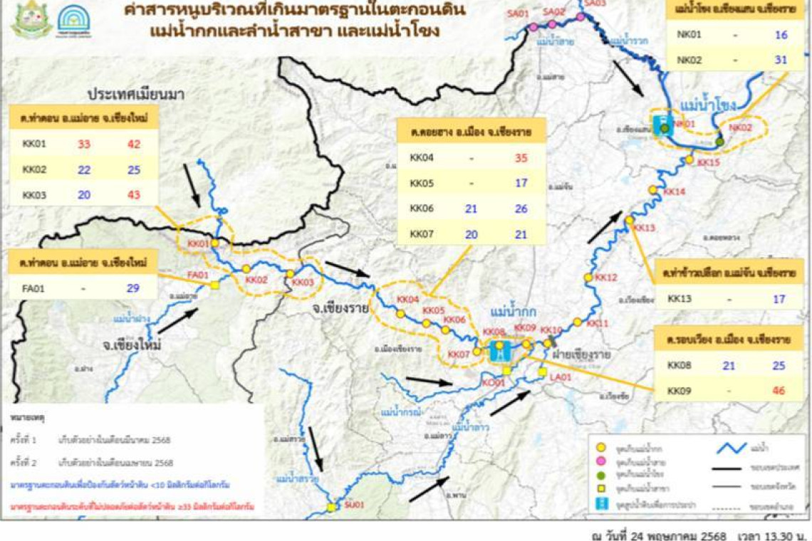 คพ.สรุปผลการตรวจวัดตะกอนดิน “แม่น้ำกก” ลำน้ำสาขา และแม่น้ำโขง ครั้งที่ 1 – 2 (รอบเดือน มีนาคม และ เมษายน 2568 )