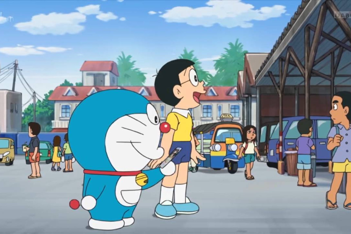 โดยเป็นเรื่องราวที่ซึเนโอะโม้ว่าได้ไปเที่ยวไทย ทำให้โดราเอมอน และ โนบิตะ จึงใช้ประตูไปไหนก็ได้ไปด้วยตัวเองบ้าง มาเที่ยวไทยโดยเฉพาะ โดยมีทั้งฉากที่นั่งช้างไทยที่ จ.พระนครศรีอยุธยา ฉากที่โดราเอมอนกับโนบิตะนั่งรถตุ๊กตุ๊ก ซอฟต์พาวเวอร์ของไทย เที่ยวที่ตลาดน้ำดำเนินสะดวก จ.ราชบุรี ที่ทั้งคู่ได้เดินกินของอร่อยมากมายในตลาดน้ำ และได้เห็นบรรยากาศสุดคึกคักของตลาดน้ำชื่อดังแห่งนี้ และยังมีฉากที่โดราเอมอนกับ โนบิตะ พูดภาษาไทยด้วย