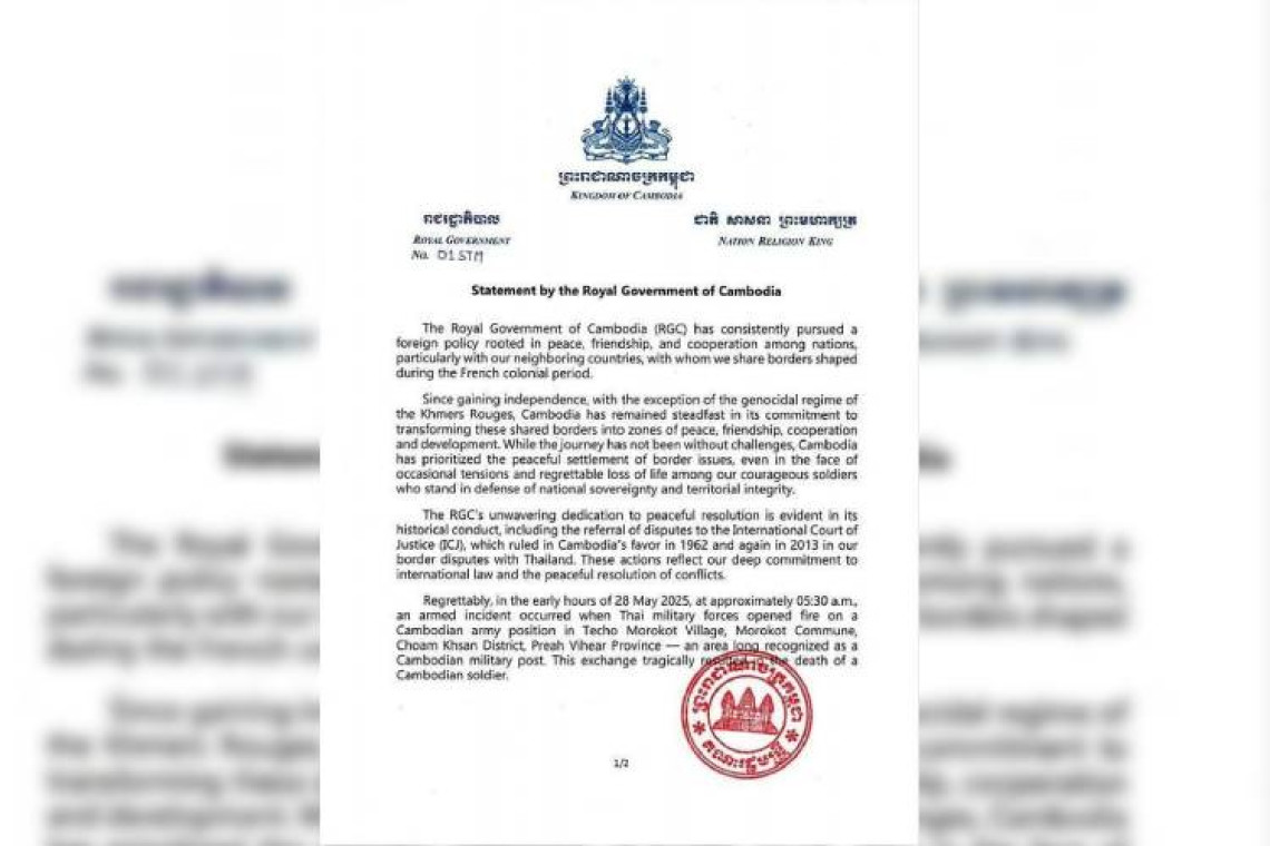 ช่วงท้ายของแถลงการณ์ รัฐบาลกัมพูชาได้อ้างถึงเหตุการณ์ที่เกิดขึ้นเมื่อวันที่ 28 พฤษภาคม 2568 เวลาประมาณ 05.30 น. โดยระบุว่า ทหารไทยได้เปิดฉากยิงเข้าใส่ฐานประจำการของกองทัพกัมพูชาในหมู่บ้าน "เตโชมรกต" จังหวัดพระวิหาร ซึ่งกัมพูชาระบุว่าเป็นพื้นที่ที่ฝ่ายตนครอบครองและประจำการมานาน เหตุการณ์ดังกล่าวส่งผลให้ทหารกัมพูชาเสียชีวิต