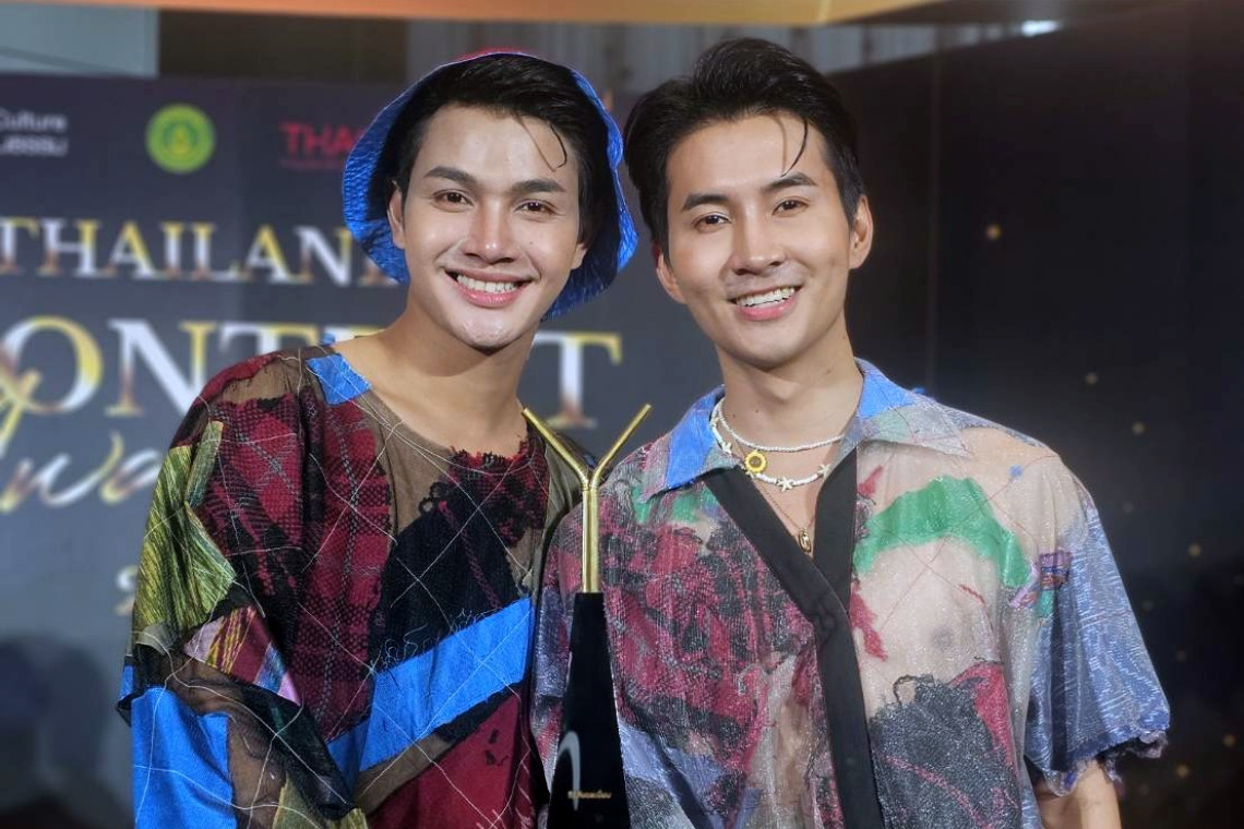 “เล้ง-แสตมป์” จากซีรีส์วาย ลอยแก้ว สร้างสีสันสุดปัง! สวมใส่ผ้าไทยร่วมสมัย สะกดทุกสายตา ในงานแถลงข่าว Thailand Y Content Awards 2024