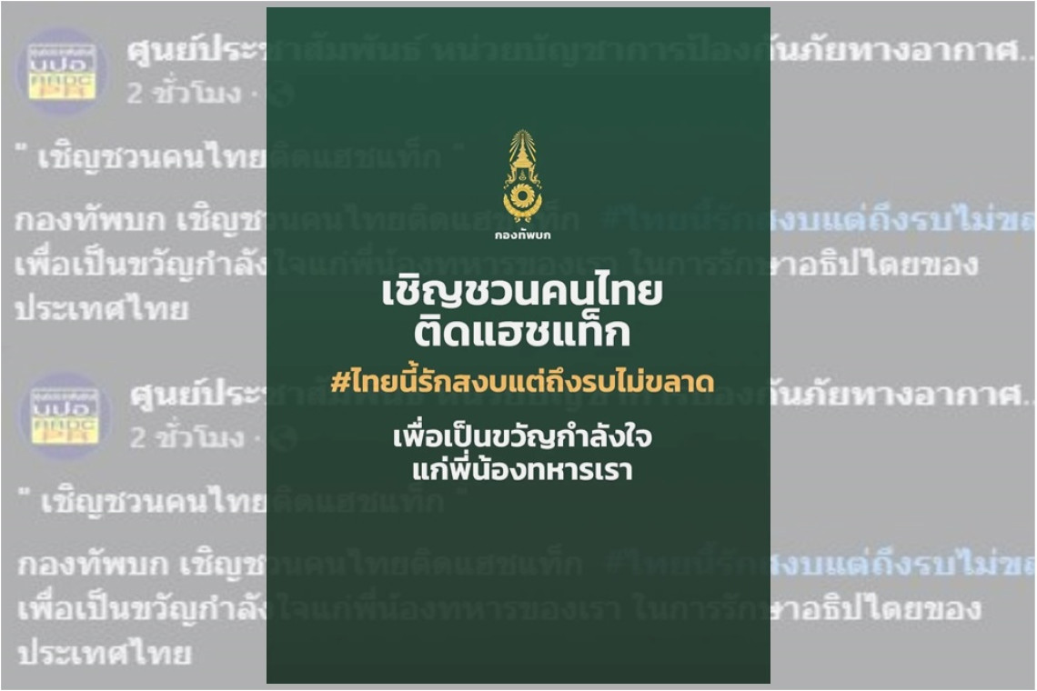 กองทัพบก เชิญชวนคนไทยติดแฮชแท็ก #ไทยนี้รักสงบแต่ถึงรบไม่ขลาด เพื่อเป็นขวัญกำลังใจแก่พี่น้องทหารของเรา ในการรักษาอธิปไตยของประเทศไทย