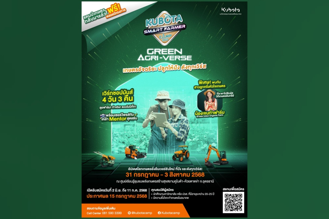 บริษัท สยามคูโบต้าคอร์ปอเรชั่น จำกัด เชิญชวนนักศึกษาที่มีใจรักในการทำเกษตรเข้าร่วม “KUBOTA Smart Farmer Camp 2025” ในธีม “Green Agri-Verse” เกษตรอัจฉริยะ ปลูกให้ปัง ดังทุกเวิร์ส พร้อมจุดประกายเยาวชนรุ่นใหม่ที่มีใจรักการเกษตร ให้ได้อัปเดตโลกการเกษตรยั่งยืน ผ่านกิจกรรมเชิงปฏิบัติสุดเข้มข้นกับที่สุดของแคมป์เกษตรสุดมันส์แห่งปี พร้อมเรียนรู้จริงจากเกษตรกรต้นแบบ และได้สัมผัสประสบการณ์เกษตรวิถีออร์แกนิกจากกูรูตัวจริงกับ น้องเจน – เจนนิเฟอร์ อินเนส-เทเลอร์ หรือ น้องเจนทำฟาร์ม เจ้าของ Udon Organic Farm จะมาร่วมแชร์แนวคิดและพาลงพื้นที่เรียนรู้การทำเกษตรอินทรีย์ นอกจากนี้ยังได้เสริมทักษะผ่านกิจกรรม เวิร์กชอปด้านการตลาด ที่จะช่วยต่อยอดองค์ความรู้และพัฒนาแนวทางสู่การเป็น นักธุรกิจเกษตรรุ่นใหม่