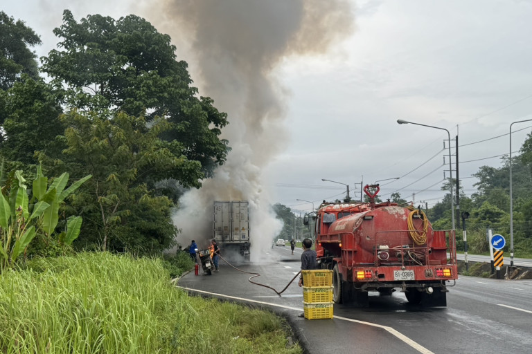 ส่วนหัวลากเป็นรถฮีโน่สีม่วง ทะเบียนป้ายเหลือง 72-xxxx พระนครศรีอยุธยา คนขับสามารถ ถอดท้ายออกจากตู้ได้ทัน โดยนำไปจอดใกล้กับแผงรับซื้อมังคุดริมทางประมาณ 50 เมตร โดยทางเจ้าหน้าที่ใช้เวลานานร่วมกว่า 20 นาที จึงสามารถดับเพลิงได้สำเร็จ แต่ยังต้องคอยฉีดน้ำพรมเข้าไปที่ใต้ท้องรถ เนื่องจากยังมีเปลวไฟปะทุกขึ้นมาจากยางรถอีกเป็นระยะ