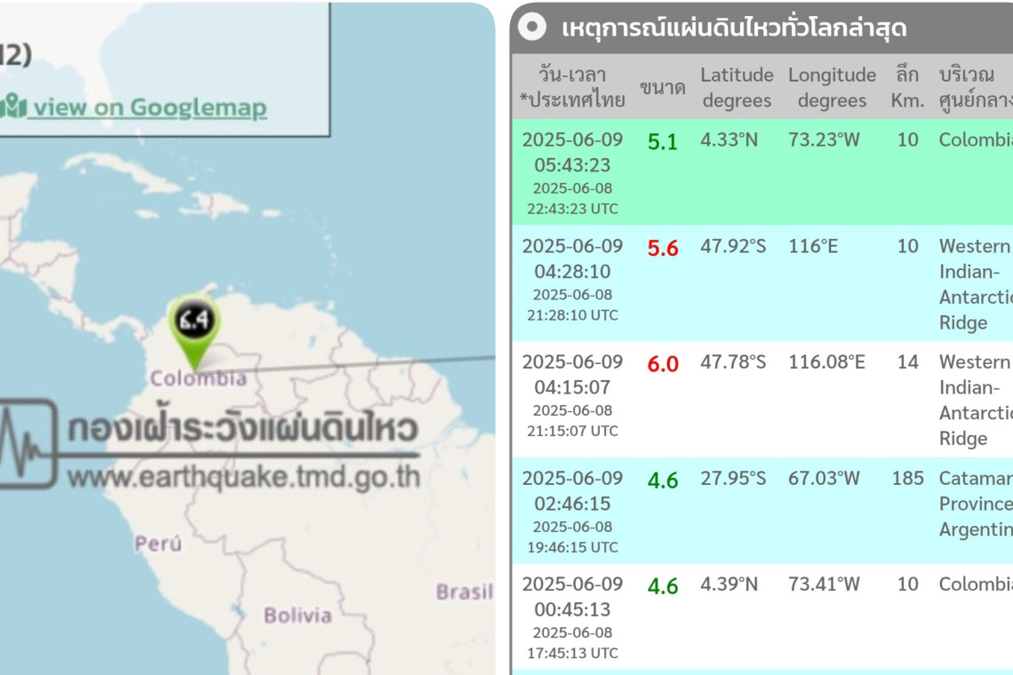 วันที่ 9มิ.ย.68-รายงานข่าวจากกองเฝ้าระวังแผ่นดินไหว กรมอุตุนิยมวิทยา แจ้งว่า หลังจาก เมื่อเวลา 20..08น.ตามเวลาของไทย ของวานนี้(8มิ.ย.68)ได้เกิดแผ่นดินไหวขนาดความรุนแรง6.4ริกเตอร์ ขนาความลึก 11กม.ที่ประเทศโคลัมเบีย ปรากฏในเวลาต่อมาได้เกิดเหุตแผ่นดินไหวประเทศโคลัมเบียกลางดึกยันรุ่งอรุณอย่างต่อเนื่อง