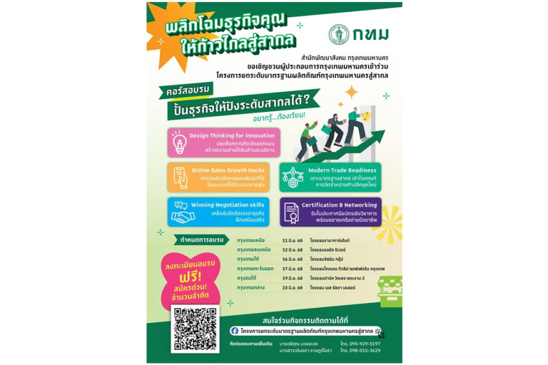 กิจกรรมที่ 1: การอบรมทักษะและ Design Thinking สำหรับผู้ประกอบการใน 6 กลุ่มเขต ของกรุงเทพมหานคร รวม 600 คน โดยเน้นการถ่ายทอดองค์ความรู้ในการวิเคราะห์กลุ่มลูกค้า สร้างนวัตกรรมในผลิตภัณฑ์ พัฒนาแนวคิดการตลาด และเรียนรู้การขายบนแพลตฟอร์มออนไลน์ เพื่อยกระดับขีดความสามารถทางธุรกิจในยุคดิจิทัล