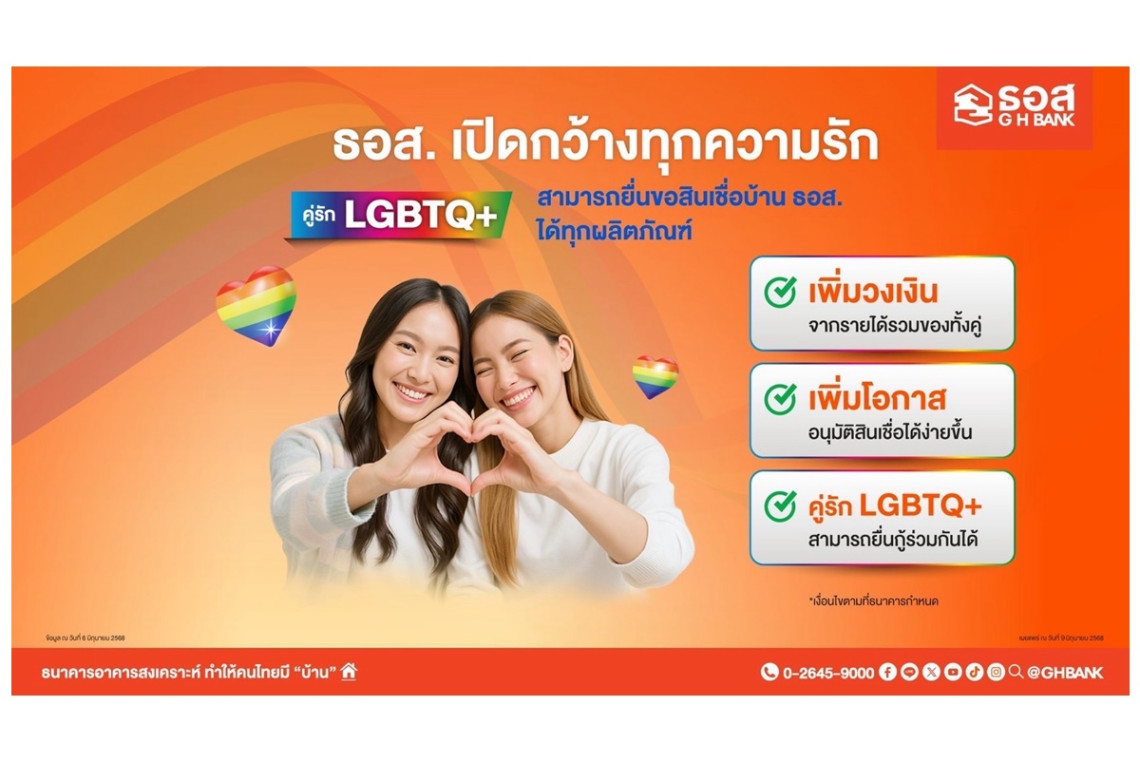 ธนาคารอาคารสงเคราะห์ (ธอส.) ตอกย้ำการเป็นสถาบันการเงินของรัฐ ที่สนับสนุนให้ทุกคนได้มีที่อยู่อาศัยเป็นของตนเอง พร้อมมีส่วนร่วมในเดือนแห่งความภาคภูมิใจของกลุ่มผู้มีความหลากหลายทางเพศ (Pride Month) ส่งเสริมทุกคู่รัก LGBTQ+ ให้มีความมั่นคงด้านที่อยู่อาศัยมากขึ้น โดยทุกคู่รัก LGBTQ+ สามารถยื่นขอสินเชื่อ
