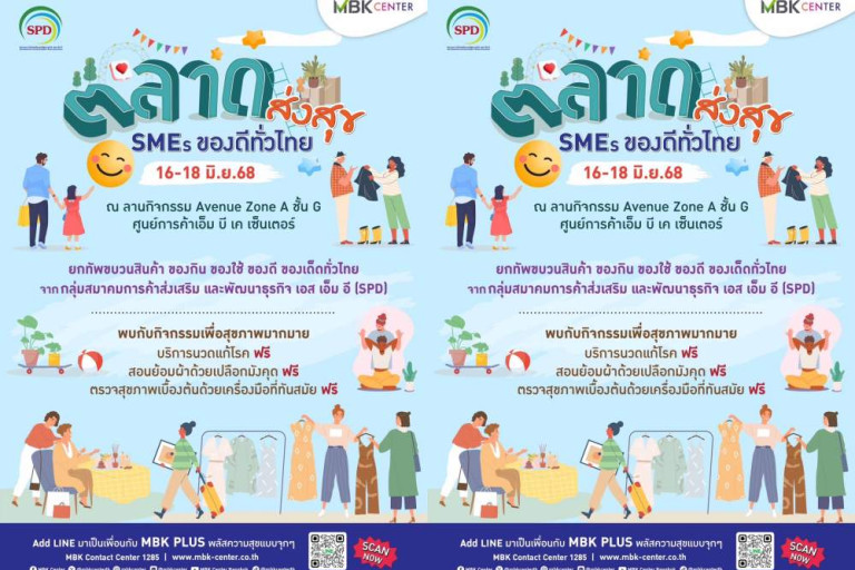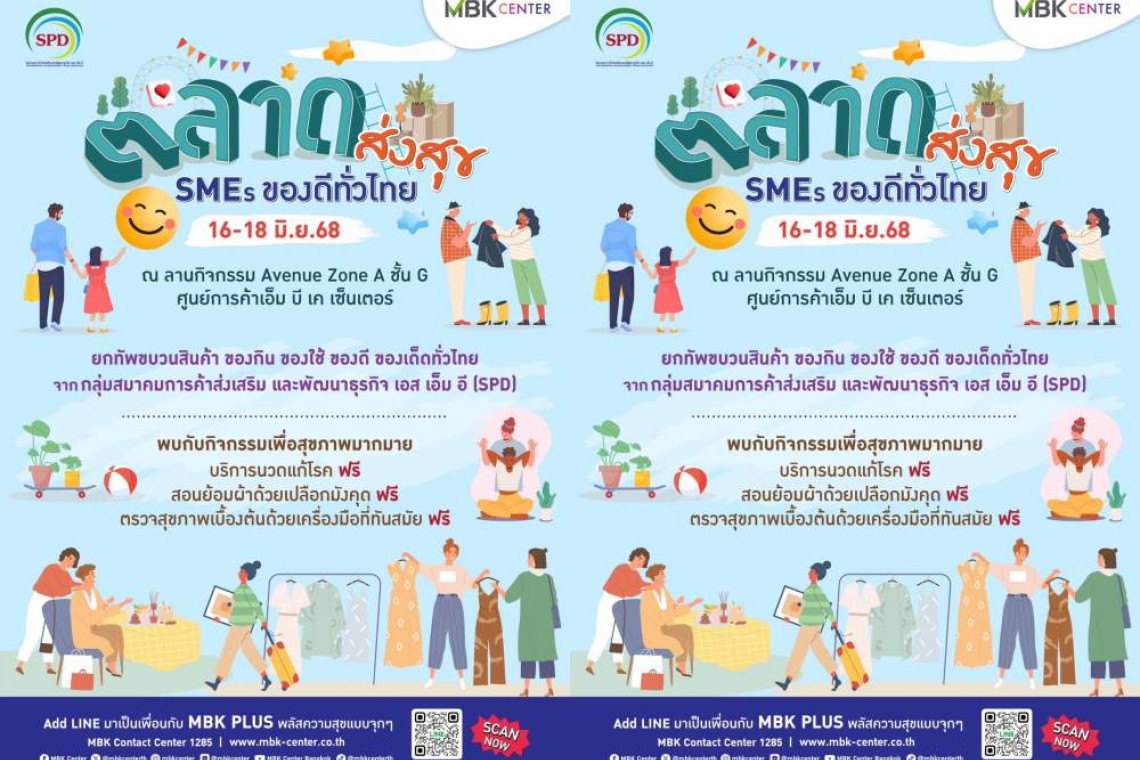 ศูนย์การค้าเอ็ม บี เค เซ็นเตอร์ เปิดพื้นที่จำหน่ายสินค้าท้องถิ่นทั่วประเทศไทย สร้างอาชีพและส่งเสริมเศรษฐกิจชุมชุมเพื่อการพัฒนาที่ยั่งยืน ร่วมกับ สมาคมการค้าส่งเสริมและพัฒนาธุรกิจ เอส เอ็ม อี (SPD) สานต่อความร่วมมือในการจัดงาน ตลาดส่งสุข SMEs ของดีทั่วไทย ตั้งแต่วันนี้ - วันพุธที่ 18 มิ.ย.68 บริเวณชั้น G ลานกิจกรรมเอ็ม บี เค อเวนิว โซน A