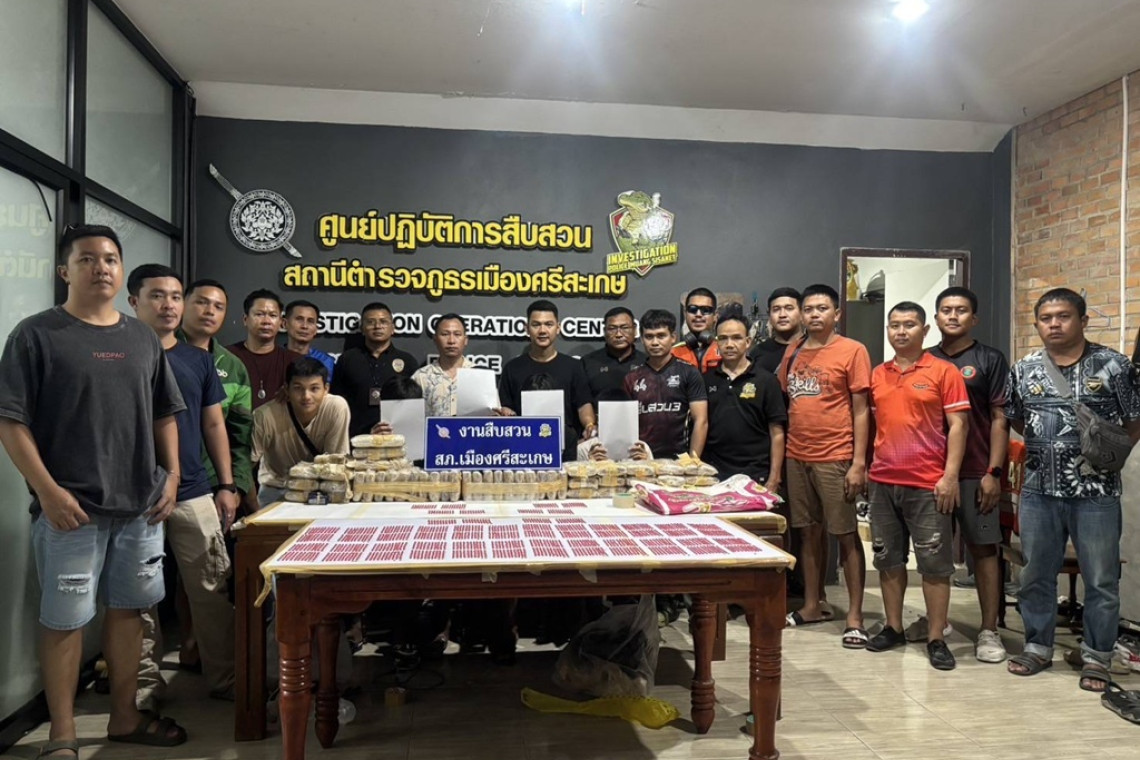 วันที่ 9 มิ.ย. 2568 ผู้สื่อข่าวรายงานว่า เมื่อกลางดึกที่ผ่านมา พ.ต.อ.นรินทร์ บุพตา ผกก.เมืองศรีสะเกษ สั่งการให้ พ.ต.ท.ศราวุฒิ คำน้อย รอง ผกก.สส.สภ.เมืองศรีสะเกษ พร้อมด้วย พ.ต.ท.ประดิษฐ์ อบอุ่น สว.สส.สภ.เมืองศรีสะเกษ นำกำลังตำรวจชุดสืบสวน สภ.เมืองศรีสะเกษ ร่วมกับ สภ.อุทุมพรพิสัย ร่วมกันจับกุมตัว นายเอ (นามสมมุติ) อายุ 21 ปี นายบี (นามสมมุติ) อายุ 20 ปี นายซี (นามสมมุติ) อายุ 21 ปี และนายเจ (นามสมมุติ) เยาวชน อายุ 16 ปี ทั้งหมดเป็นชาว อ.กันทรลักษ์ จ.ศรีสะเกษ พร้อมของกลาง ยาบ้าจำนวนทั้งสิ้น 274,720 เม็ด กระสอบปุ๋ย จำนวน 1 กระสอบ ถุงพลาสติกสีดำ จำนวน 2 ใบ โทรศัพท์มือถือ จำนวน 5 เครื่อง รถยนต์ยี่ห้อ ISUZU D-MAX สีขาว ทะเบียนกรุงเทพมหานคร จำนวน 1 คัน รถยนต์ยี่ห้อ ISUZU D-MAX สีขาว ทะเบียนศรีสะเกษ จำนวน 1 คัน จึงทำการตรวจยึดไว้เป็นหลักฐาน