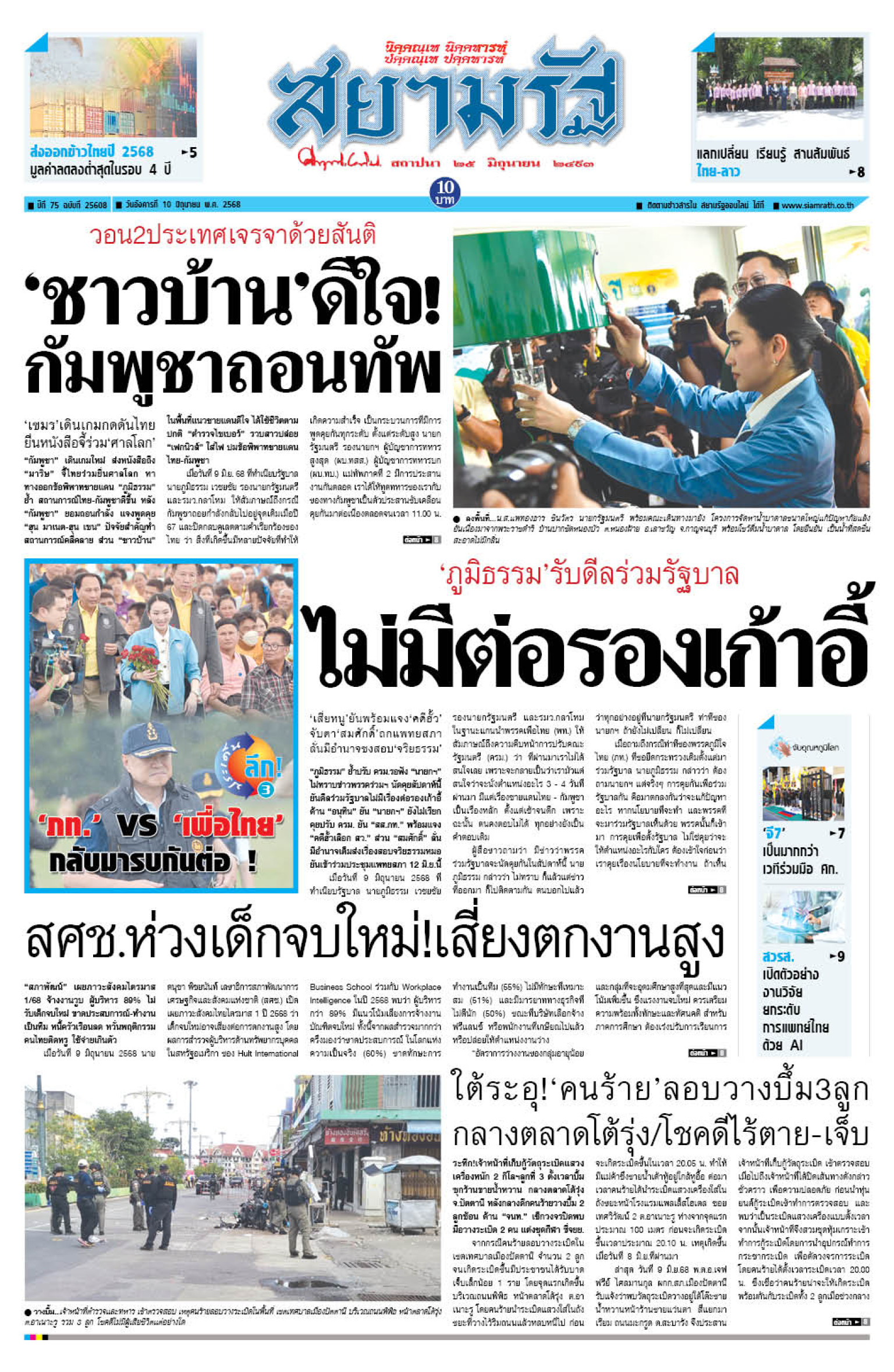 หน้า 1 หนังสือพิมพ์สยามรัฐรายวัน ฉบับวันอังคารที่ 10 มิถุนายน 2568