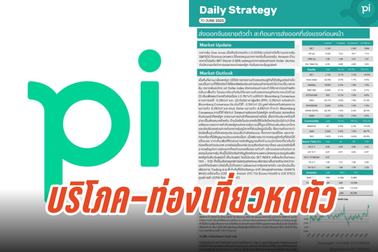 วันที่ 10 มิถุนายน 2568 บล.พายเผยว่า ตลาดหุ้น Dow Jones เมื่อคืนปิดทรงตัว (-0.003%) แต่อย่างไรก็ตามตลาดหุ้น S&P500 ปิดแดนบวกเพราะได้แรงหนุนจากการปรับขึ้นของหุ้น Amazon ด้านราคาน้ำมันดิบ BRT ปิดบวก 0.86% แรงหนุนจากการอ่อนค่าของ Dollar ประกอบกับมีความหวังว่าการเจรจาระหว่างสหรัฐฯ กับจีนจะกระตุ้นอุปสงค์