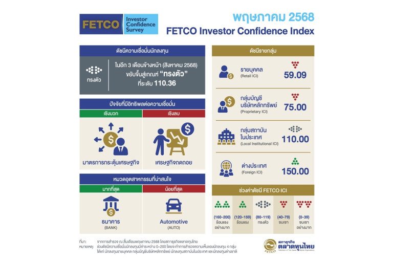 วันที่ 10 มิถุนายน 2568 นายกอบศักดิ์ ภูตระกูล ประธานกรรมการสภาธุรกิจตลาดทุนไทย เปิดเผยดัชนีความเชื่อมั่นนักลงทุน (FETCO Investor Confidence Index) ผลสำรวจในเดือนพฤษภาคม 2568 (สำรวจระหว่างวันที่ 19-31 พฤษภาคม 2568) พบว่า “ดัชนีความเชื่อมั่นนักลงทุน (FETCO Investor Confidence Index: ICI) ในอีก 3 เดือนข้างหน้าปรับขึ้นมาอยู่ในเกณฑ์ ทรงตัว” ที่ระดับ 110.36 นักลงทุนมองว่ามาตรการกระตุ้นเศรษฐกิจของภาครัฐ เป็นปัจจัยหนุนความเชื่อมั่นมากที่สุด รองลงมาคือการฟื้นตัวของเศรษฐกิจในประเทศ และการไหลเข้าของเงินทุน ปัจจัยที่ฉุดความเชื่อมั่นนักลงทุนมากที่สุด ได้แก่ การถดถอยของเศรษฐกิจในประเทศ รองลงมาคือสงครามการค้า และความกังวลต่อวินัยการคลัง