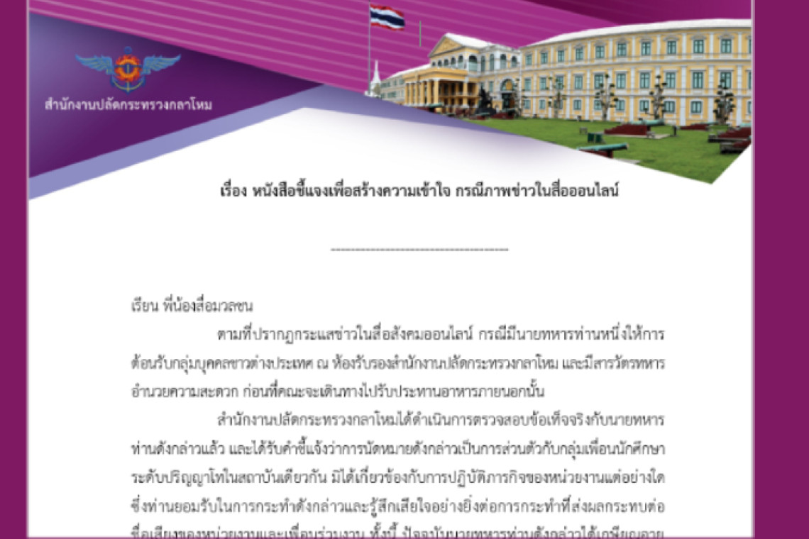 วันที่ 10 มิ.ย.68 สำนักงานปลัดกระทรวงกลาโหม ออกหนังสือชี้แจงกรณีภาพข่าวบนสื่อสังคมออนไลน์ ซึ่งปรากฏภาพนายทหารรายหนึ่งให้การต้อนรับกลุ่มชาวต่างชาติ ณ ห้องรับรองของสำนักงานฯ โดยมีสารวัตรทหารอำนวยความสะดวกก่อนที่กลุ่มดังกล่าวจะเดินทางไปรับประทานอาหารนอกสถานที่