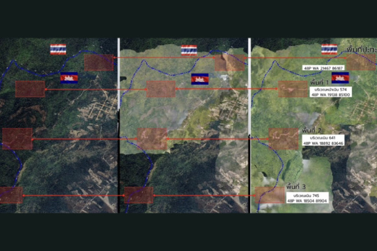 โฆษกกองบัญชาการกองทัพไทยเผยภาพถ่ายดาวเทียมชุดใหม่ เปิดแผนที่ ภาพถ่ายดาวเทียม อีกชุด ชัดๆ ทหารเขมร ปรับกำลังออกไปแล้ว พร้อมแผนที่ เปรียบเทียบทหารเขมร  รุกเข้ายึด 3 เนิน ในพื้นที่อ้างสืทธิ์ทับซ้อน ทั้ง เนิน 574, 641 และเนิน 745 ในแต่ละห้วง ปี 2560-2563-2568 พบ ทหารเขมร ขุดคูเลต สร้างฐานที่มั่น  ทำให้ สภาพพื้นที่ เปลี่ยนแปลง ถือว่า ละเมิดข้อตกลง MoU 2543 โดยเฉพาะจุดปะทะ 28 พ.ค.2568