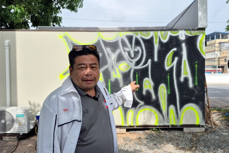 ซึ่งตู้คอนเทนเนอร์ ดังกล่าว เพิ่งได้รับการติดตั้งใหม่ เพื่อเป็นที่พักของเจ้าหน้าที่กู้ภัยฯ ขณะปฏิบัติหน้าที่ฉุกเฉิน ในช่วงเช้าของวันนี้พบว่า พื้นผิวตู้ถูกพ่นสีเลอะเทอะด้วยลวดลายกราฟฟิตี้ที่ไม่เหมาะสม อีกทั้งตู้ไฟของการไฟฟ้าที่อยู่ใกล้เคียงก็ถูกพ่นสี ด้วยเช่นกัน