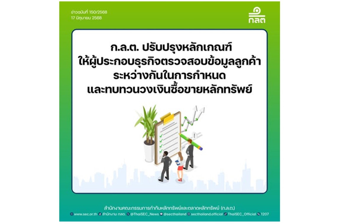 ก.ล.ต.ปรับปรุงหลักเกณฑ์การกำหนดให้ผู้ประกอบธุรกิจตรวจสอบข้อมูลลูกค้าระหว่างกันสำหรับใช้ประกอบการพิจารณากำหนดและทบทวนวงเงินซื้อขายหลักทรัพย์ให้แก่ลูกค้าได้อย่างเหมาะสมต่อความสามารถในการชำระหนี้ มีผลบังคับใช้ 1 ก.พ.69