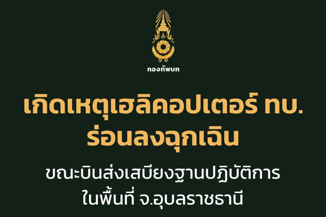 ช่วงบ่ายวันนี้ (17 มิ.ย.68) กองทัพบกได้รับรายงานจากกองกำลังสุรนารี กองทัพภาคที่ 2 กรณีเกิดเหตุอากาศยานเฮลิคอปเตอร์ของกองทัพบก เสียการควบคุมจนต้องทำการร่อนลงฉุกเฉิน เนื่องจากเกิดเหตุขัดข้องขณะปฏิบัติภารกิจสับเปลี่ยนกำลังพลและส่งเสบียงให้กับฐานปฏิบัติการในพื้นที่อำเภอน้ำยืน จ.อุบลราชธานี โดยปัจจุบันได้รับรายงานว่ากำลังพลบางส่วนได้รับบาดเจ็บเล็กน้อย ปัจจุบันกำลังนำส่งโรงพยาบาลในพื้นที่ สำหรับรายละเอียดการเกิดเหตุจะได้มีการชี้แจงให้ทราบต่อไป