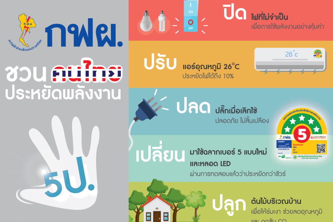 การไฟฟ้าฝ่ายผลิตแห่งประเทศไทย (กฟผ.) ขอเชิญชวนคนไทยใช้พลังงานอย่างประหยัด เพื่อลดปริมาณการใช้พลังงานในภาพรวมของประเทศ และลดการนำเข้าน้ำมันและก๊าซธรรมชาติ (LNG) จากต่างประเทศ เตรียมรับมือวิกฤตพลังงาน ผ่านมาตรการ 5 ป. คือ