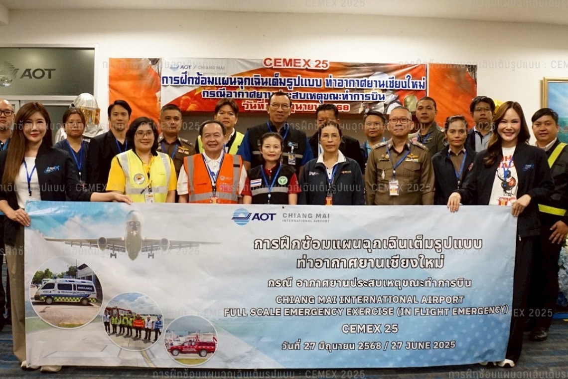 เมื่อช่วงเย็นวันที่ 27 มิถุนายน 2568 นาวาอากาศโท รณกร เฉลิมแสนยากร ผู้อำนวยการท่าอากาศยานเชียงใหม่ เป็นประธานเปิดการฝึกซ้อมเต็มรูปแบบตามแผนฉุกเฉิน ท่าอากาศยานเชียงใหม่ บทที่ 3 กรณีอากาศยานประสบภัยขณะทำการบิน (In-flight Emergencies) ประจำปี 2568 ภายใต้รหัสฝึกซ้อม CEMEX25 โดยมีผู้บริหาร หน่วยงานการแพทย์ทั้งภาครัฐและเอกชน ผู้แทนส่วนราชการ ผู้แทนสายการบิน ผู้ประกอบการ และหน่วยงานต่าง ๆ ที่เกี่ยวข้อง เข้าร่วมฝึกซ้อมและทบทวนขั้นตอนการปฏิบัติอย่างพร้อมเพรียง ทั้งนี้ได้รับการสนับสนุนอากาศยานของสายการบินไทยแอร์เอเชีย (Thai AirAsia) สำหรับใช้ในการจำลองสถานการณ์ เที่ยวบิน AV 619 ของสายการบิน AWA Airlines เส้นทางคุณหมิง – ภูเก็ต ประสบเหตุตกหลุมอากาศอย่างรุนแรงขณะทำการบิน และขอลงจอดฉุกเฉิน ณ ท่าอากาศยานเชียงใหม่ มีผู้โดยสารได้รับบาดเจ็บจำนวนมาก และมีผู้เสียชีวิต