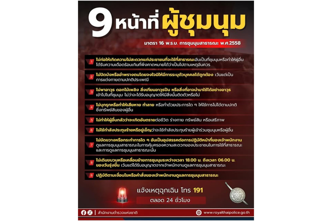 เมื่อวันที่ 28 มิ.ย.68 เพจเฟซบุ๊กของ "กองบัญชาการตำรวจนครบาล - บช.น. Metropolitan Police Bureau" โพสตร์รูป พร้อมข้อความระบุว่า สำนักงานตำรวจแห่งชาติ ขอประชาสัมพันธ์ หน้าที่ของผู้ชุมนุมในการชุมนุมสาธารณะ พึงปฏิบัติเพื่อร่วมกันบริหารจัดการการชุมนุมสาธารณะให้เป็นไปด้วยความสงบเรียบร้อย ไม่ละเมิดสิทธิเสรีภาพของผู้อื่น