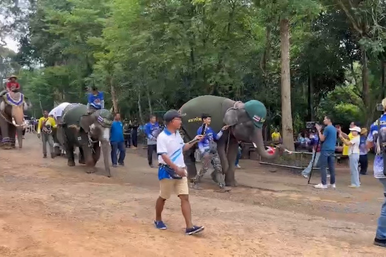 วันนี้ 28 มิ.ย.68 เมื่อเวลา 12.00 น.ที่ปราสาทตาเมือนธม ต.ตาเมียง อ.พนมดงรัก จ.สุรินทร์ นายณัฐพล โพธิ์ล้อม หรือควาญเปา ได้นำช้าง 4 เชือก เดินทางมาจากหมู่บ้านตากลาง ต.กระโพ อ.ท่าตูม จ.สุรินทร์ แต่งกายชุดทหารพร้อมอาวุธและแต่งชุดพยาบาล เข้ามาให้กำลังใจทหารในพื้นที่และนำอาหารและน้ำดื่ม ที่ทาง FC ของช้างรวบรวมกันมามอบให้กับทหาร สร้างสีสันบรรยากาศให้กับพื้นที่ปราสาทตาเมือนธมเป็นอย่างมาก โดยมีนักท่องเที่ยวและประชาชนต่างให้ความสนใจร่วมถ่ายภาพกับช้างกันเป็นจำนวนนมาก และในการมาครั้งนี้ยังได้นำตะขอช้างมามอบเพื่อเป็นขวัญกำลังใจให้กับท่านแม่ทัพอีกด้วย