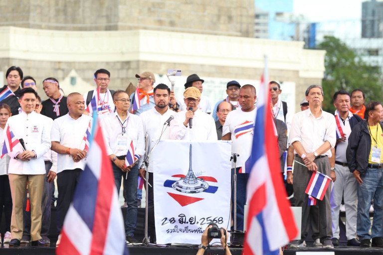 เมื่อเวลา 17.30 น. วันที่ 28 มิ.ย 68 ที่อนุสาวรีย์ชัยสมรภูมิ ผู้สื่อข่าวรายงานบรรยากาศการผู้ชุมนุมของกลุ่ม “รวมพลังแผ่นดินปกป้องอธิปไตย” ที่ยังคงปักหลักต่อเนื่อง แม้จะมีฝนตกลงมาอย่างหนักในช่วงบ่าย โดยกลุ่มมวลชนยังคงเดินทางเข้าร่วมอย่างต่อเนื่อง เต็มพื้นที่