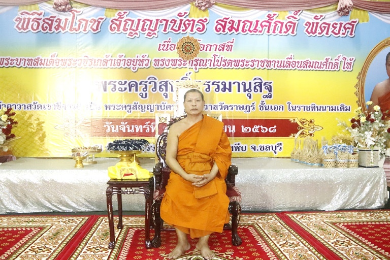 เมื่อวันที่ 30 มิ.ย. 68 คณะสงฆ์อำเภอสัตหีบ ประชาชนชาวสัตหีบ และศิษยานุศิษย์ เข้าร่วม พิธีสมโภชสัญญาบัตร สมณศักดิ์ พัดยศและผ้าไตรพระราชทาน ในโอกาสที่พระบาทสมเด็จพระวชิรเกล้าเจ้าอยู่หัว โปรดพระราชทานเลื่อนสมณศักดิ์ ให้ พระครูวิสุทธิ์ธรรมานุสิฐ (สมศักดิ์ คุณธมโม) น.ธ.เอก พธ.บ.เจ้าอาวาสวัดเขาชีจรรย์ เป็นพระครูสัญญาบัตร เจ้าอาวาสวัดราษฎร์ ชั้นเอก ในราชทินนามเดิม ณ ศาลาการเปรียญวัดเขาชีจรรย์ ตำบลบางเสร่ อำเภอสัตหีบ จังหวัดชลบุรี โดยมี นาย ตัน ภาสกรกรนที นาย อนุศักดิ์ พิริยอมร นายอำเภอสัตหีบ ผู้นำองค์กรปกครองส่วนท้องถิ่น กำนัน ผู้ใหญ่บ้าน พ่อค้า แม่ค้า ประชาชน เข้ามร่วมในพิธี