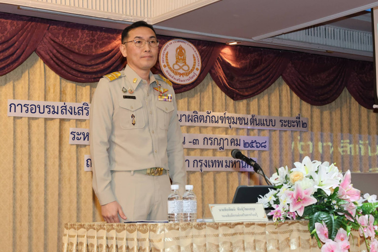 วันที่ 30 มิถุนายน 2568 ที่โรงแรมรอแยลเบญจา กทม. นายธนากร ดอนเหนือ อธิบดีกรมส่งเสริมการเรียนรู้ มอบหมายให้นายชัยพัฒน์ พันธุ์วัฒนสกุล รองอธิบดีกรมส่งเสริมการเรียนรู้ เป็นประธานในพิธีเปิดอบรม “การส่งเสริมการเรียนรู้และพัฒนาผลิตภัณฑ์ชุมชนต้นแบบ ระยะที่ 2” เพื่อพัฒนาผลิตภัณฑ์ชุมชนในพื้นที่ตามแผนการพัฒนาผลิตภัณฑ์ใหม่ สร้างทักษะความรู้ ความเข้าใจเกี่ยวกับมาตรฐานผลิตภัณฑ์ การรับรองสิทธิ อันเป็นการส่งเสริมให้เกิดมูลค่าเพิ่มทางการตลาดและสร้างความเชื่อมั่นแก่ผู้บริโภค เกิดทักษะการเรียนรู้ด้านการจัดทำแผนธุรกิจชุมชน พร้อมทั้งกิจกรรมลงมือปฎิบัติจริง (Workshop) ในการออกแบบโลโก้ ฉลากสินค้าแบรนด์สินค้าและบรรจุภัณฑ์ของผลิตภัณฑ์ให้มีรูปแบบที่สวยงามและเหมาะสมกับสินค้าแต่ละประเภท ตามลำดับ