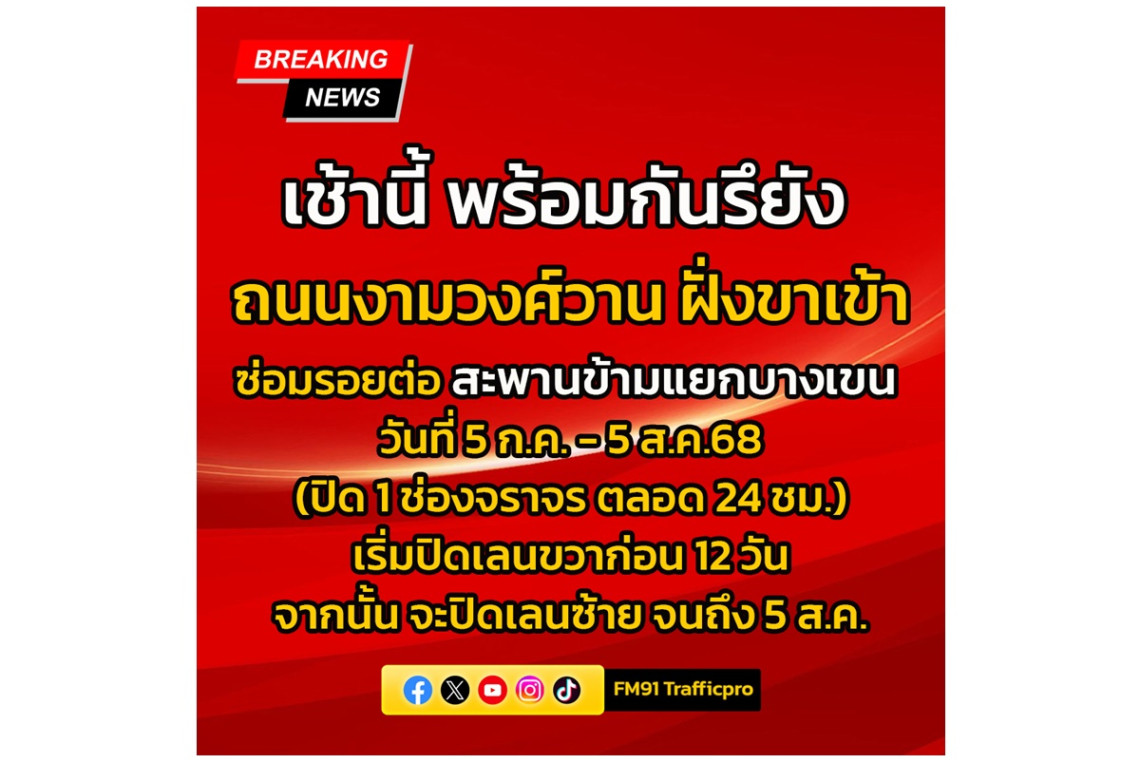 พร้อมกันรึยัง ? งานซ่อมรอยต่อ สะพานข้ามแยกบางเขน ถนนงามวงศ์วาน ฝั่งขาเข้า ตั้งแต่วันที่ 5 ก.ค. - 5 ส.ค.68