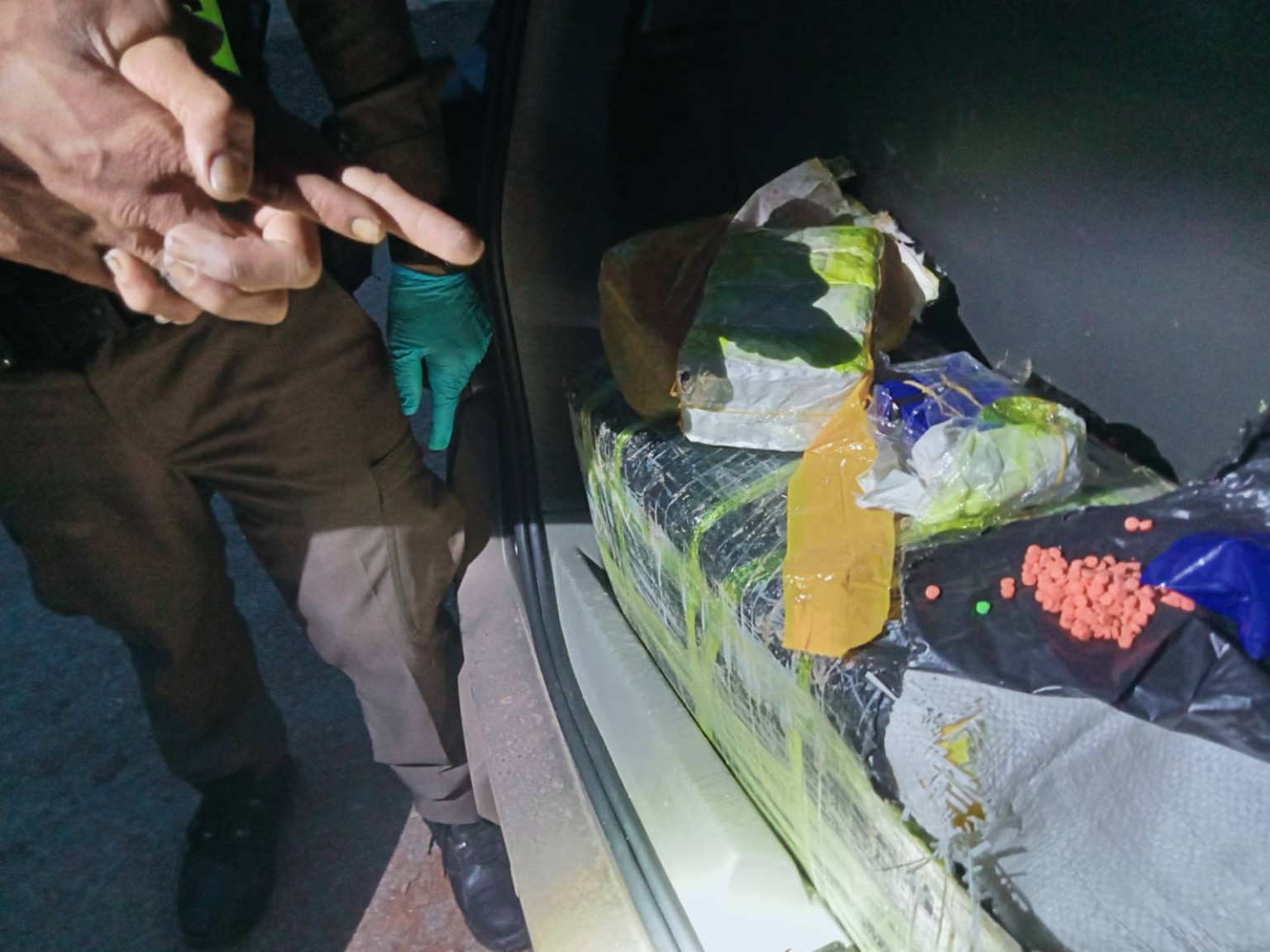 พร้อมตรวจยึดของกลาง 1.ยาเสพติดให้โทษประเภท 1 เมทแอมเฟตามีน (ยาบ้า) บรรจุอยู่ในถุงพลาสติดใส จำนวน 10 ห่อ ๆละ 10 ถุง บรรจุเป็นมัดหุ้มด้วยกระดาษไขครีม (ประทับตรา รูปแอปเปิ้ล มี่อักษร 999 สีน้ำเงิน) จำนวน 46 มัด มัดละ 10,000 เม็ด รวมเป็นยาบ้า 460,000 เม็ด บรรจุอยู่ในกระสอบสีขาวห่อหุ้มด้วยถุงพลาสติดสีดำพันด้วยเทปใส จำนวน 9 กระสอบ รวมยาบ้าทั้งสิ้น ประมาณ 4,048,000 เม็ด 2.รถยนต์เก๋ง ยี่ห้อ Chevrolet สีเทา หมายเลขทะเบียน กอ 187 ลพบุรี 3.โทรศัพท์มือถือ ยี่ห้อ Iphone สีเทา หมายเลขโทรศัพท์ 0817940500 สถานที่จับกุม บริเวณปั๊ม ปตท.พระยืน ทล.2062 กม.10-11 ต.พระยืน อ.พระยืน จ.ขอนแก่น เมื่อวันที่ 5 ก.ค.68 เวลา ประมาณ 04.20 น.