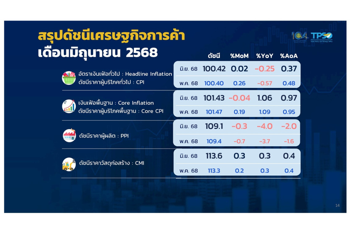 เงินเฟ้อไทย มิ.ย.68 ลดลง 3 เดือนติด -0.25% ต่ำสุดในอาเวียน คงเป้าทั้งปี 0.0–1.0%