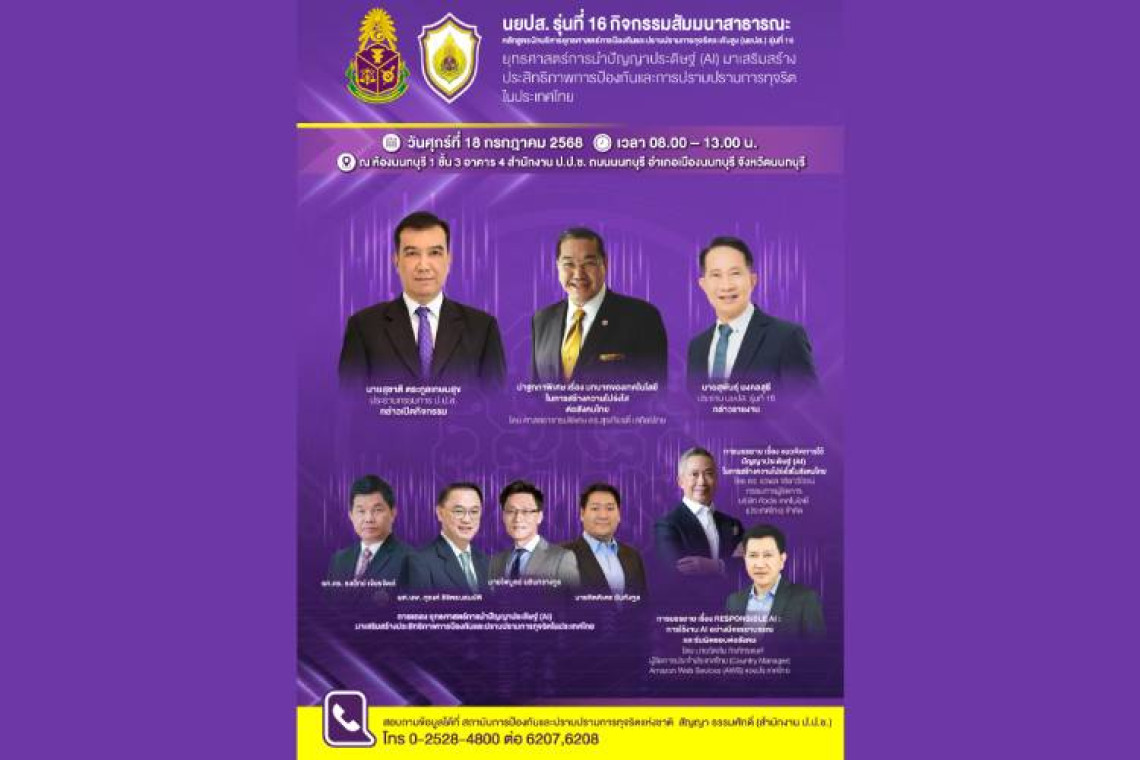 นักบริหารยุทธศาสตร์การป้องกันและปราบปรามการทุจริตระดับสูง (นยปส.) รุ่นที่ 16 สถาบันการป้องกันและปราบปรามการทุจริตแห่งชาติ สัญญา ธรรมศักดิ์ สำนักงานป.ป.ช. โดยคุณสุพันธุ์ มงคลสุธี ประธาน นยปส.รุ่น16 ขอเชิญร่วมงานสัมมนาสาธารณะหัวข้อ "ยุทธศาสตร์การนำปัญญาประดิษฐ์ (AI) มาเสริมสร้างประสิทธิภาพการป้องกันและปราบปรามการทุจริตในประเทศไทย”